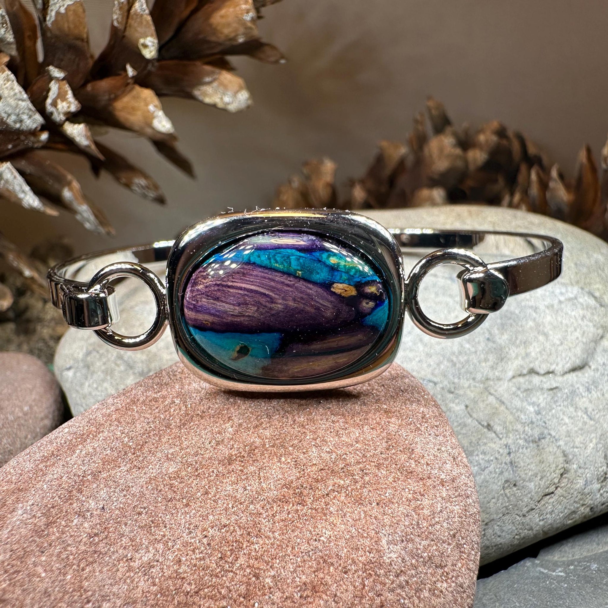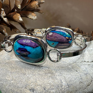 The unique 3/4" wide square center stone of this bracelet is made from heather gathered in Scotland's highlands. Each piece is hand painted and no two pieces are alike - a true work of art representing the beauty of the Highlands.