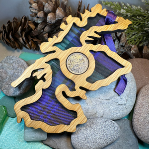 Tartan and oak wood Scotland Map Ornament with an authentic lucky sixpence coin that will make a beautiful addition to your holiday decor!