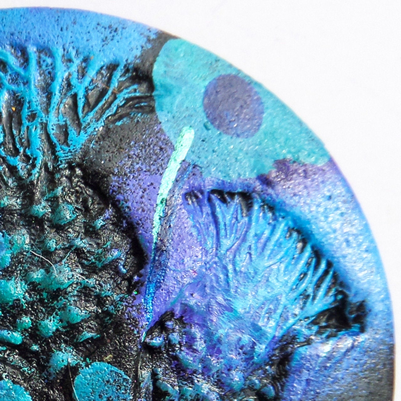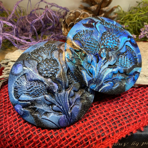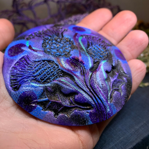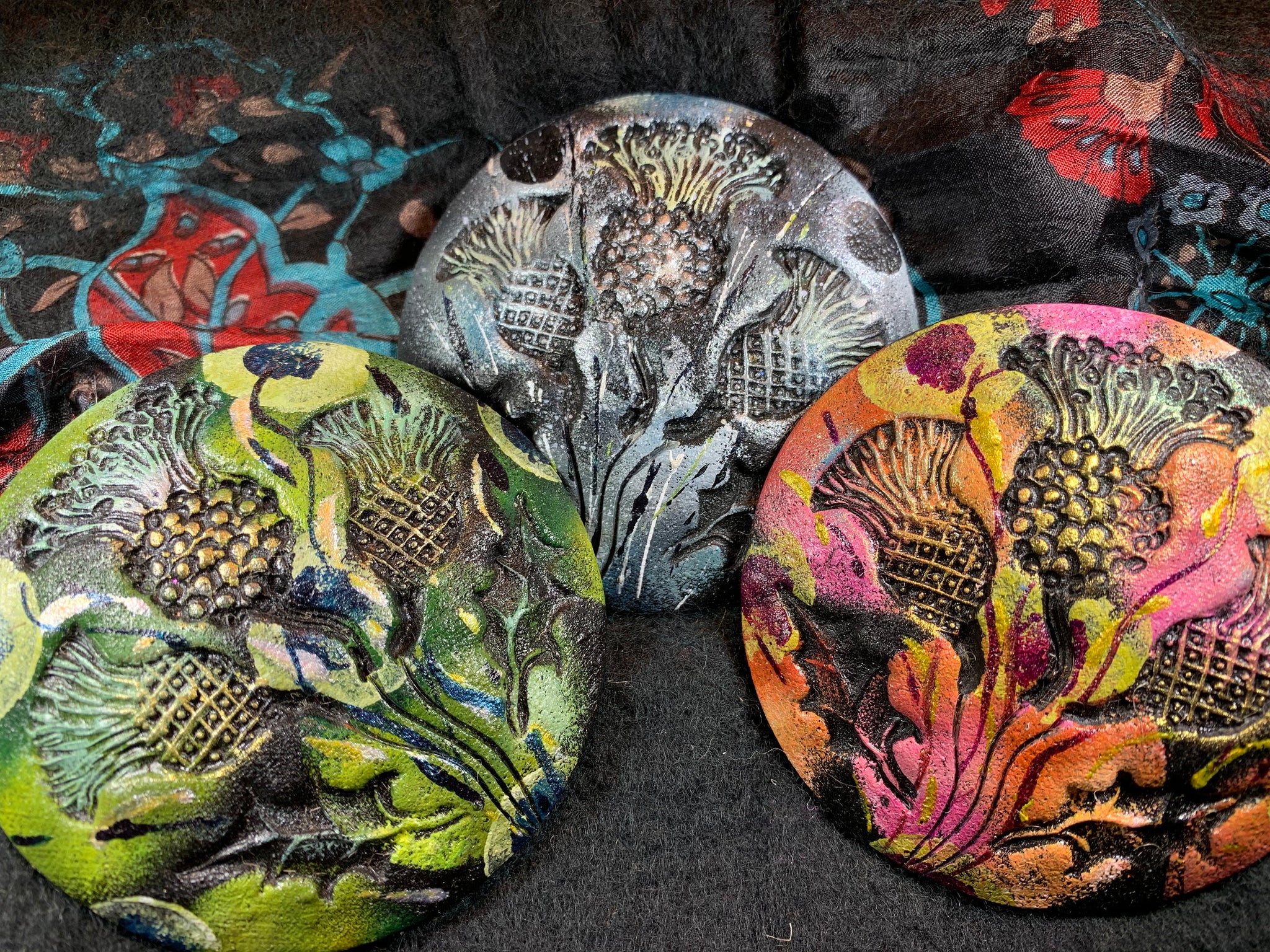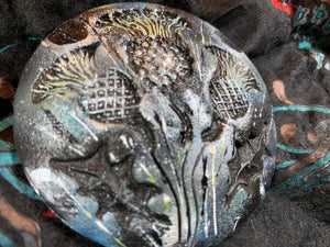 Three embossed thistles highlighted with multi colors. Hand made and hand painted making it an original piece of art. A stunning accessory to complement a wrap, scarf or coat, it can also be used as a kilt pin.