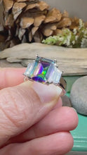 Solid Sterling Silver Ring with large faceted Mystic Topaz gemstone in an emerald cut.