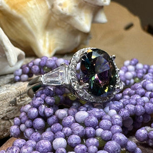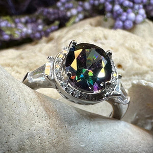 Solid Sterling Silver with a large four carat faceted mystic topaz and diamond zirconia accent stones.