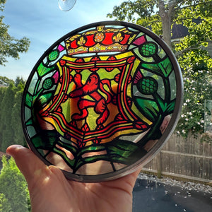 This Celtic window art glows in the beautiful colors of the famous stained glass window at Stirling Castle. This heraldic Scottish design features the Lion Rampant and Thistles, based on the window in the Magdalene Chapel, Edinburgh. The Magdalen Chapel (or Magdalene Chapel) is a 16th-century chapel on Cowgate in the heart of Old Town in Edinburgh, Scotland.