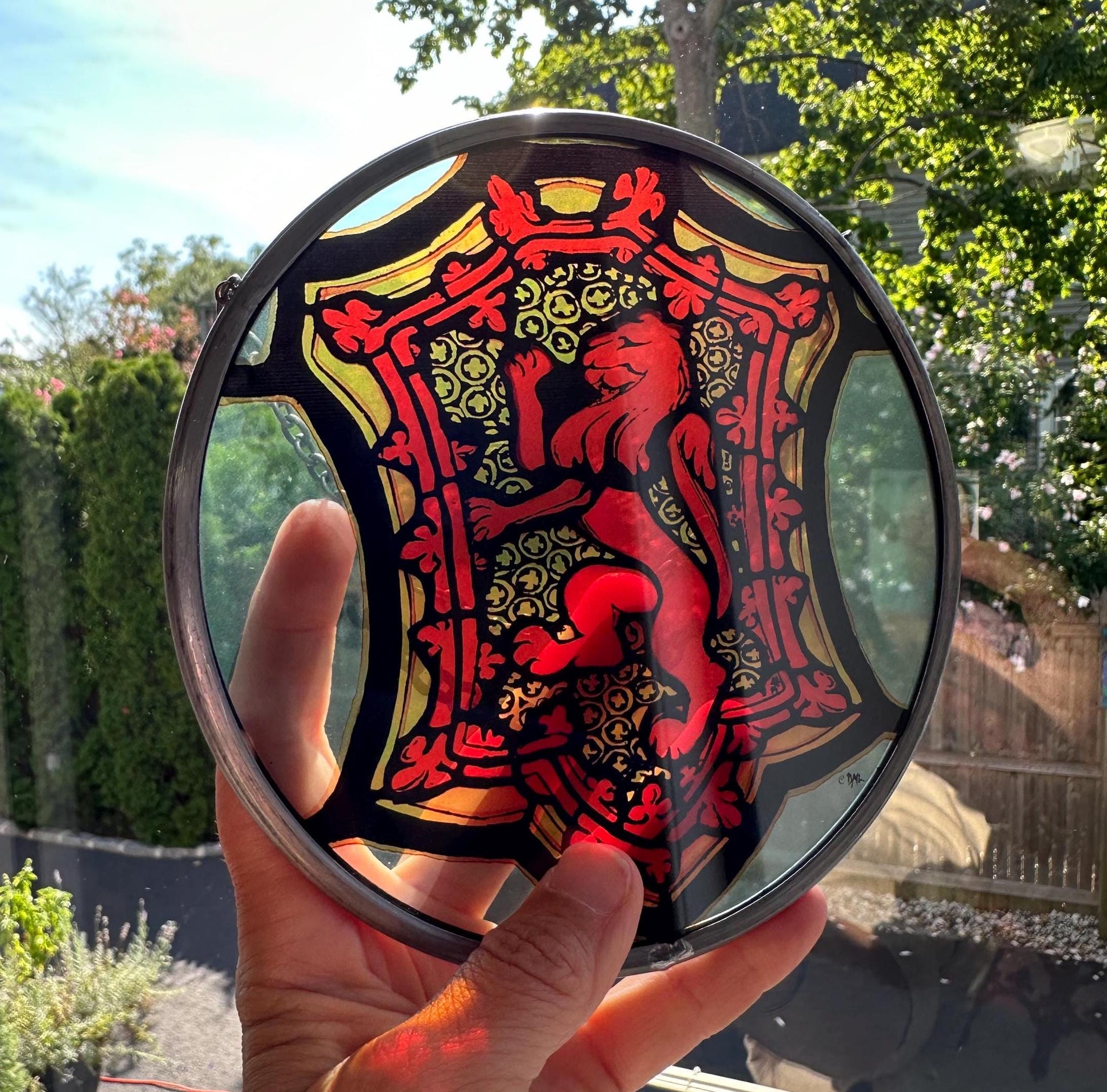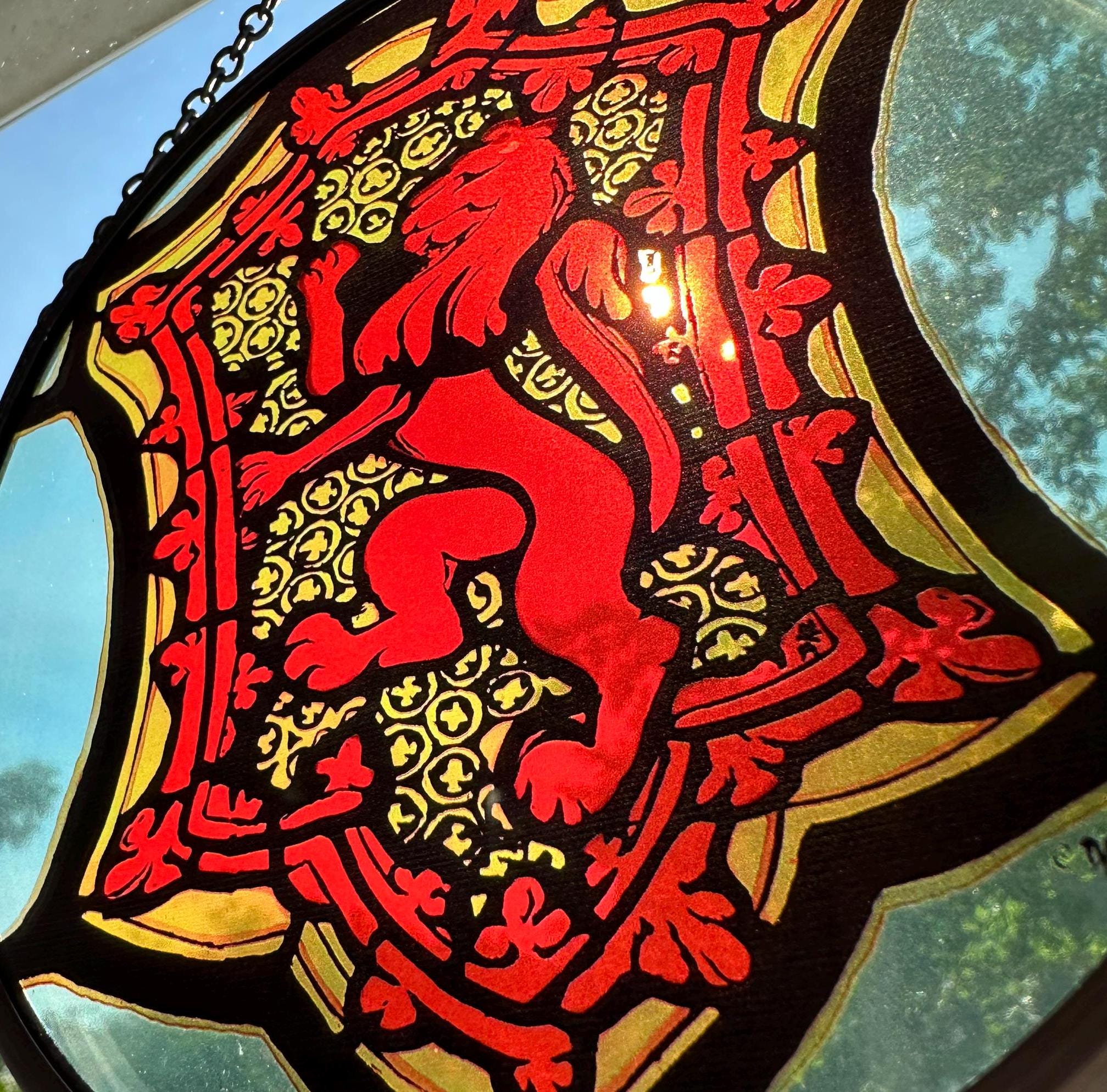 This Celtic window art glows in the beautiful colors of the famous stained glass window at Stirling Castle. The Lion Rampant, Royal Banner of Scotland, taken from the Argyle window in St. Giles Cathedral, Edinburgh.