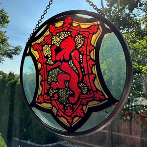 The Scottish Lion design features the Lion Rampant and can be found in St. Giles Cathedral, Scotland. The Lion Rampant is a royal emblem of Scotland and associated with Kings. This design also features a King's Crown, the emblem of royalty in Scotland.