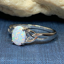 The traditional elements of the trinity knot with a glowing lab created opal - sterling silver or rose gold plated with a oval shaped lab-created white fire opal.