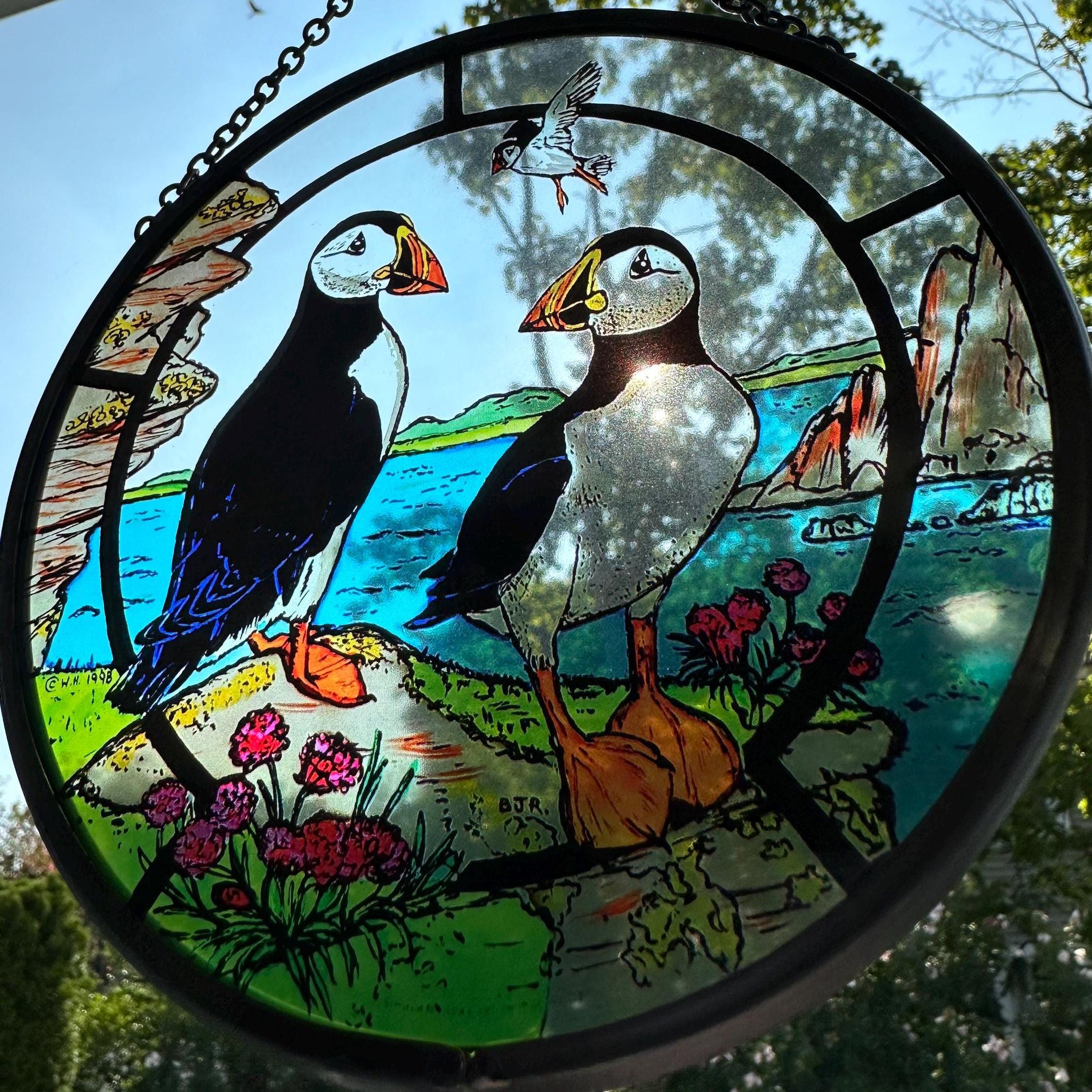 This sweet Puffin window art glows in beautiful colors of the Scottish landscape. The puffins are pictured in the Scottish Isles, but they could equally be off the Northumberland coast. It's early summer, and the pink thrift is blooming. A beautiful tranquil scene for any lover of these sea birds.
