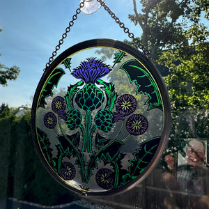 This Celtic window art glows in the beautiful colors of the famous stained glass window at Stirling Castle. A wonderful design featuring the Scottish thistle drawn in the Art Nouveau style.