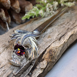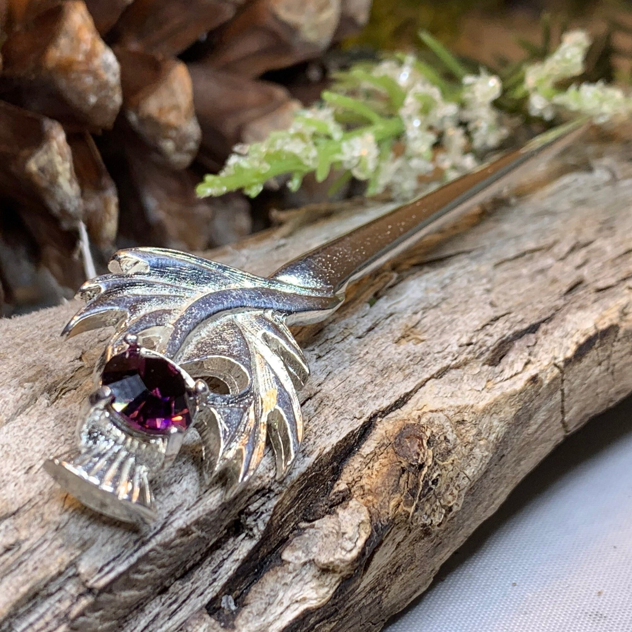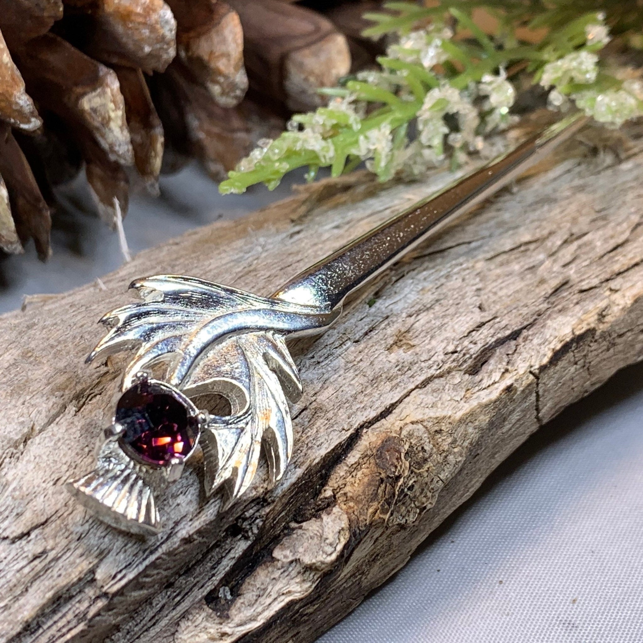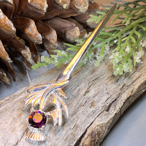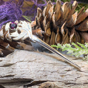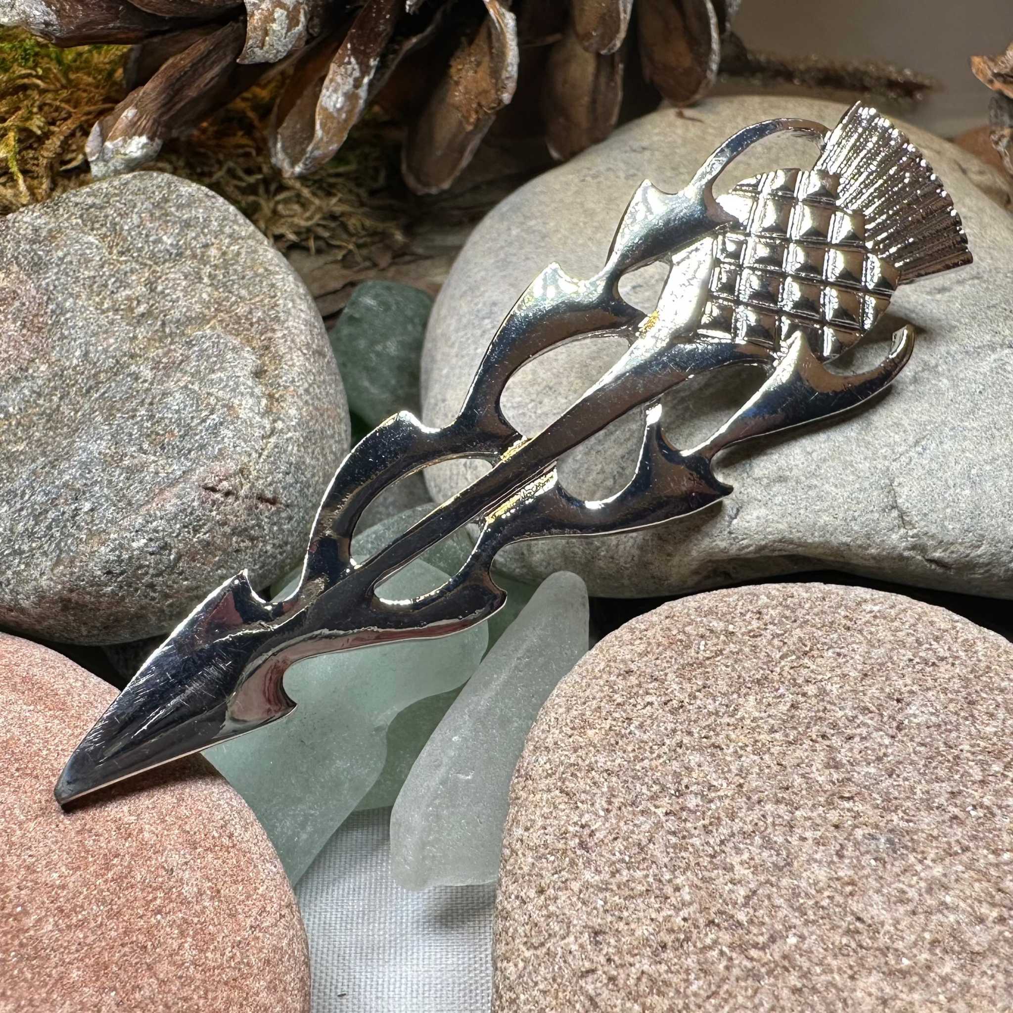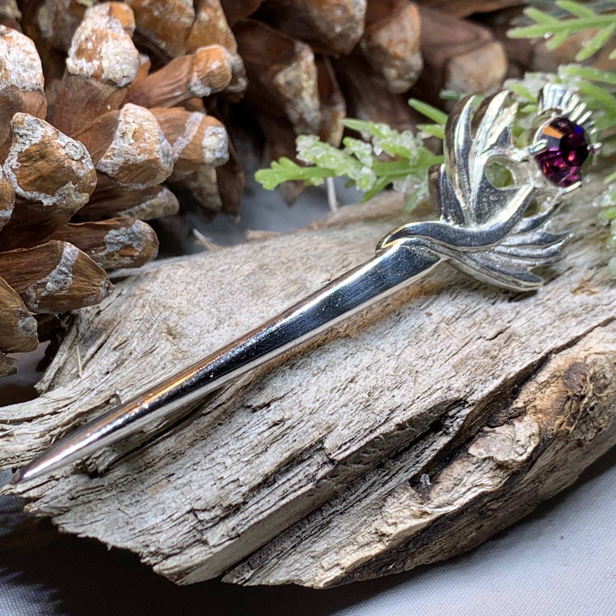 A truly beautiful kilt pin with a modern design - this pin features a beautiful thistle with a high shine, all in sterling silver plated pewter.
