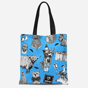 Featuring Scottish icons from castles to haggis and puffins to pipers – including both of Scotland's national drinks and their national flower (the thistle!) to boot; this fun bag is a fantastic souvenir of Scotland and the perfect gift to send or take to friends or family. Flat, canvas tote bag with thick webbing handles.