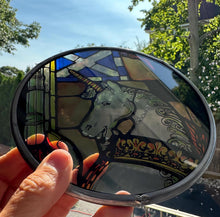 The design of this piece is unique because the hand-painted glass is pressed between two acutal glass panels rather than the acrylic or plastic found on most "stained glass" pieces. This gives the piece a beautiful translucent quality that can be appreciated in any window or on any wall! Each piece handmade with beautiful historically accurate detailing. The result is a colorful work of art that will brighten the indoors