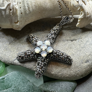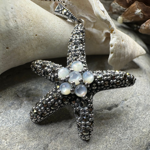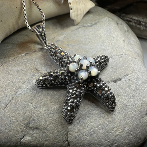 Expertly handcrafted in solid Sterling Silver, this pendant boasts an exquisite mother of pearl gemstone and glistening marcasite gems. Just like the stars in the sky, the starfish is a mesmerizing creation of nature.