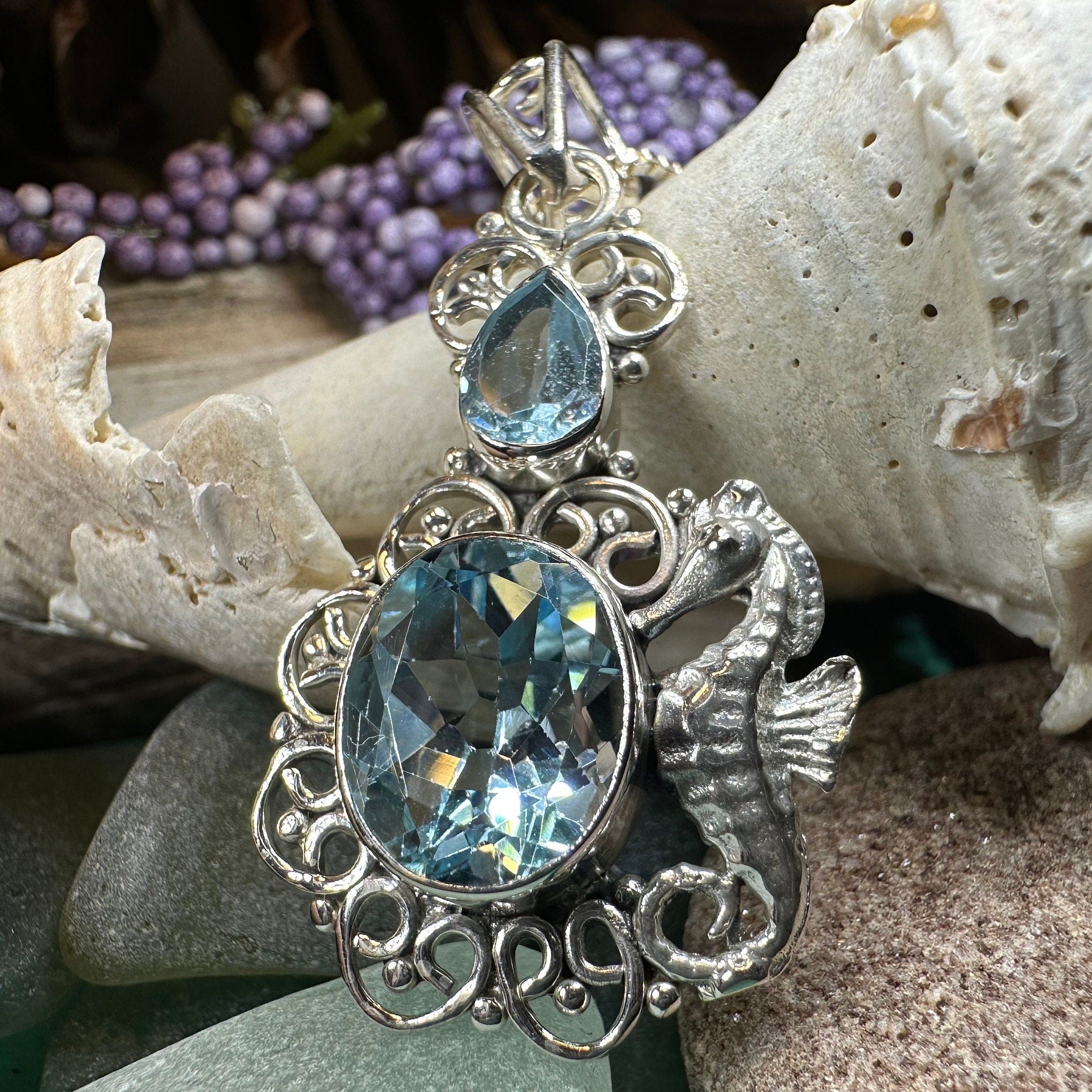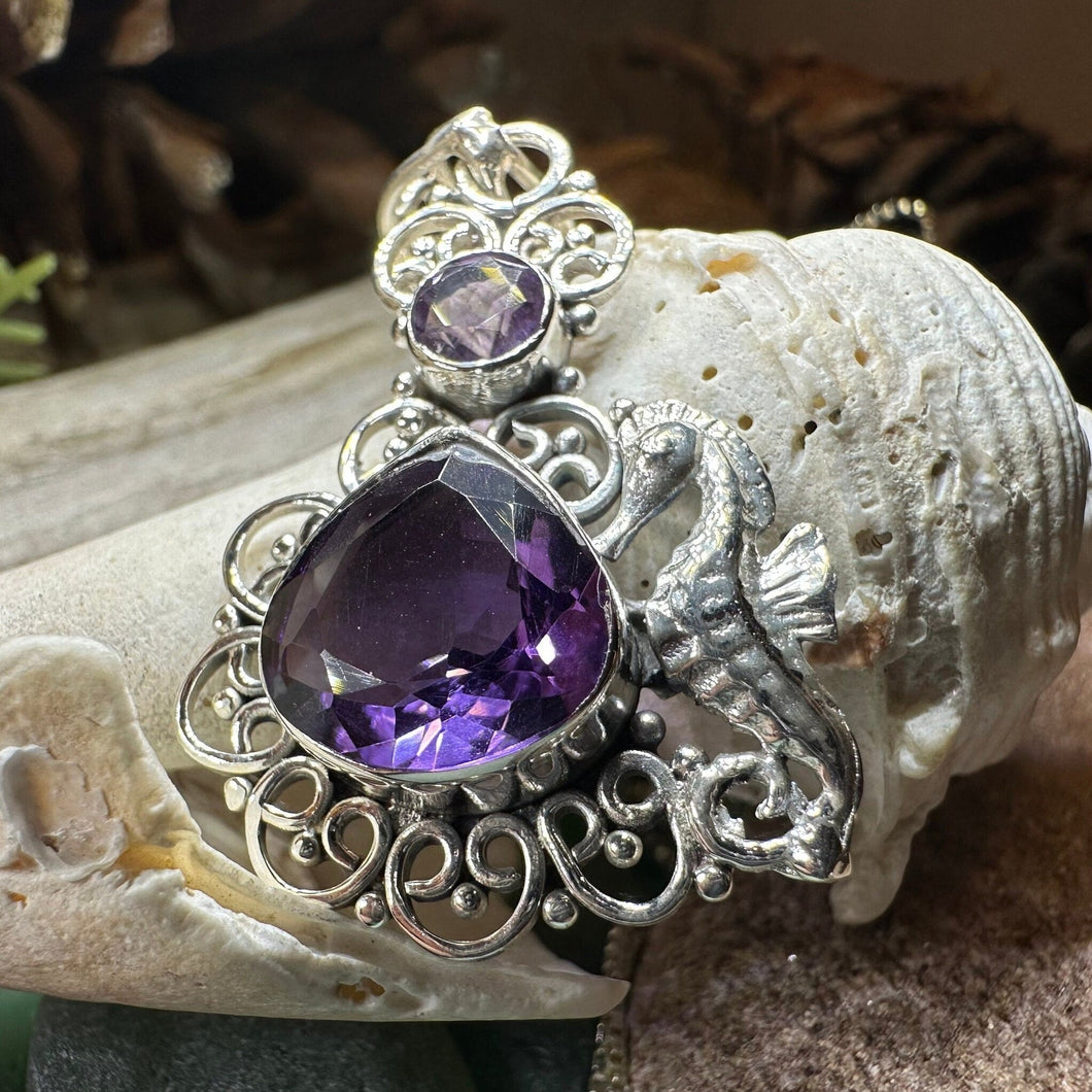 Solid Sterling Silver Seahorse Pendant with authentic large gemstone and your choice of accents gemstones: authentic purple amethyst, authentic citrine, authenic green amethyst or authentic blue topaz.