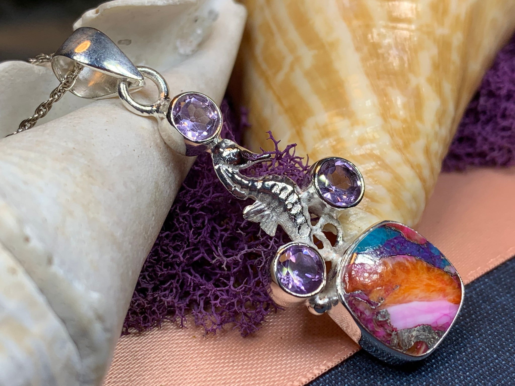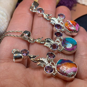 2" x 3/4" solid sterling silver with marcasite gemstones and garnet cabochon "eye". Comes on an 18" sterling silver chain.