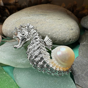 Celebrate your love of Celtic culture and the ocean with this whimsical Celtic seahorse! this beautiful seahorse is a large, eye catching piece with glowing freshwater pearl!
