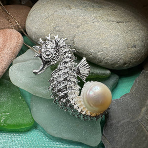 Solid Sterling Silver Seahorse Pendant with natural freshwater pearl