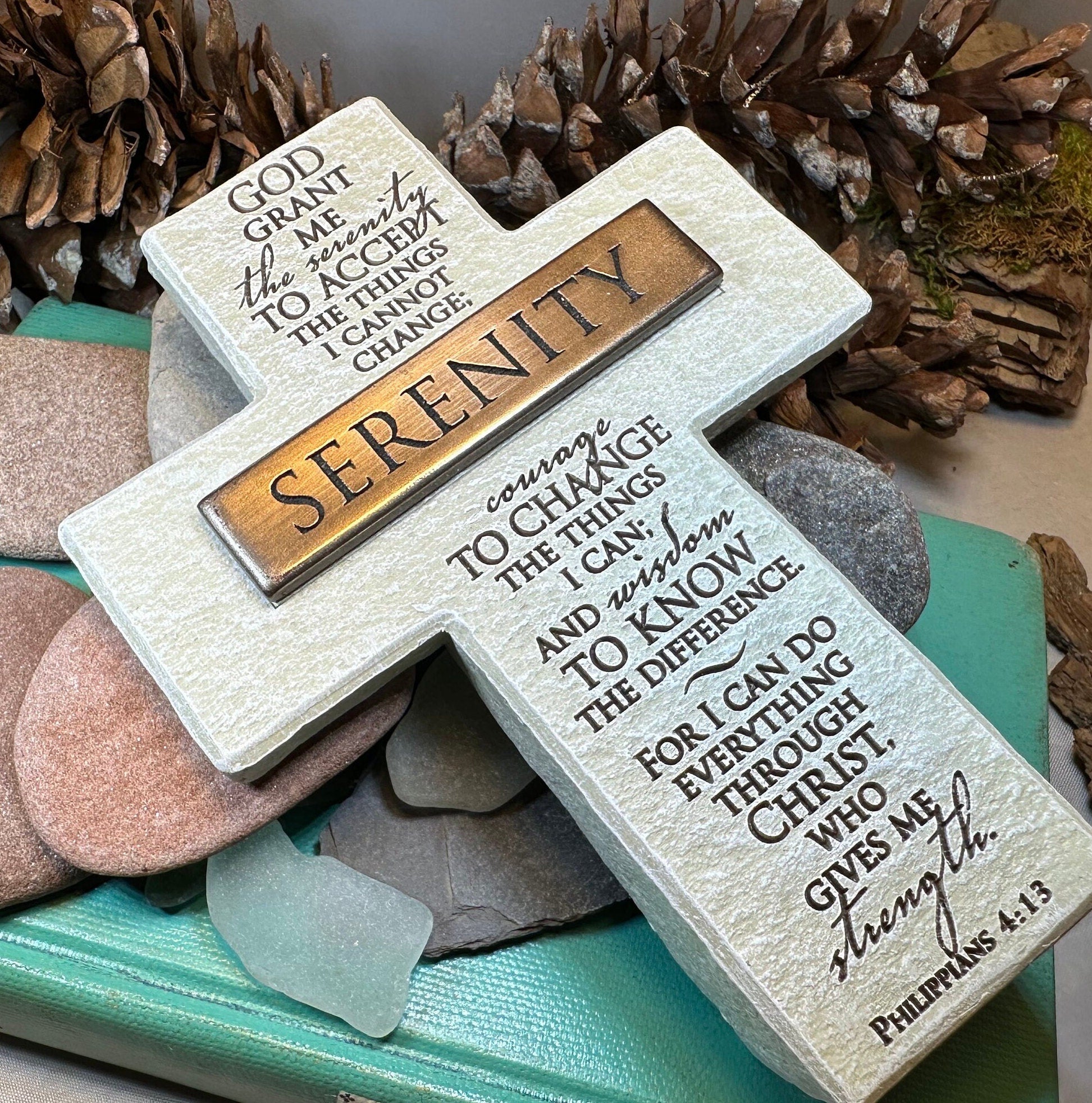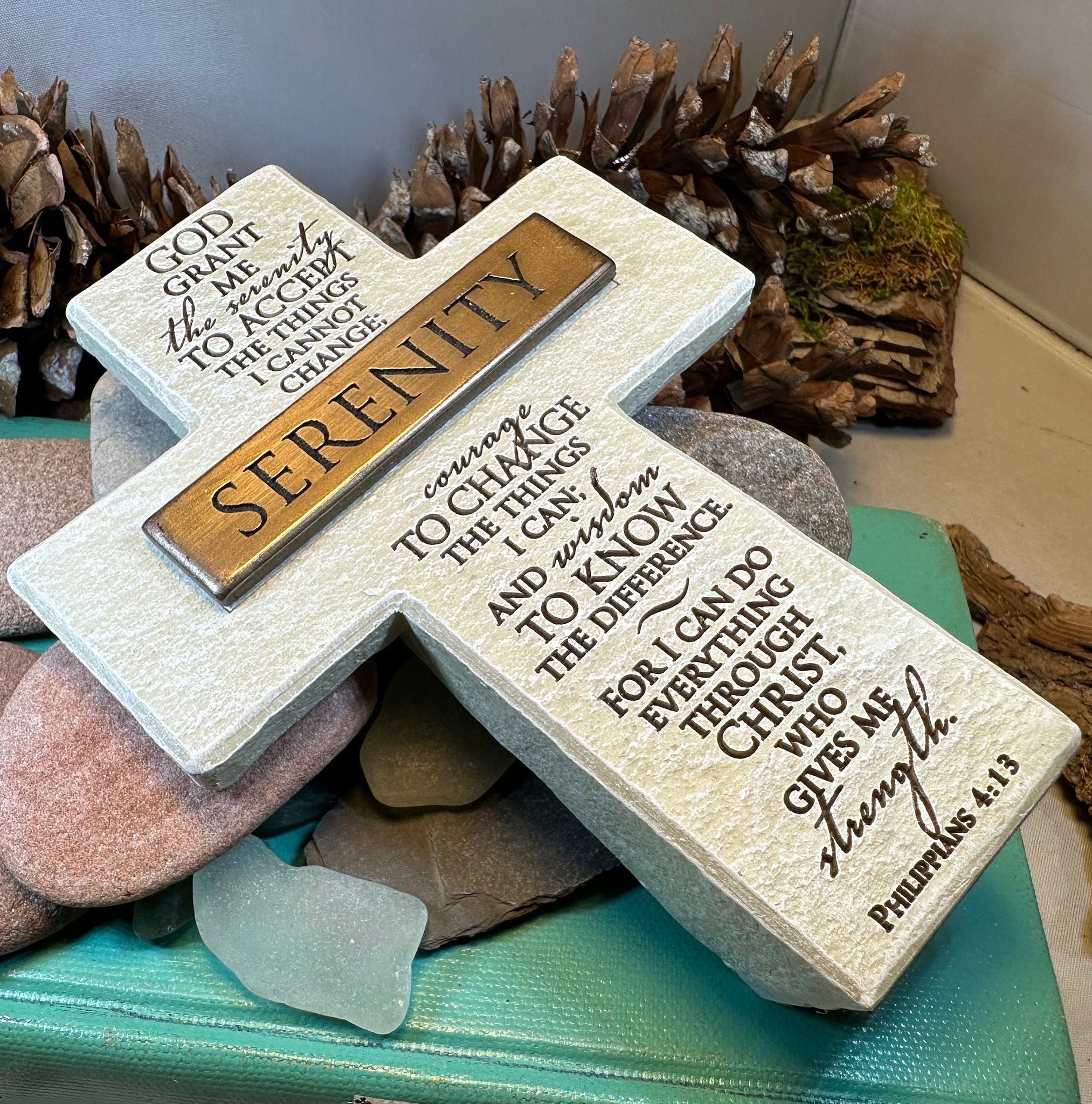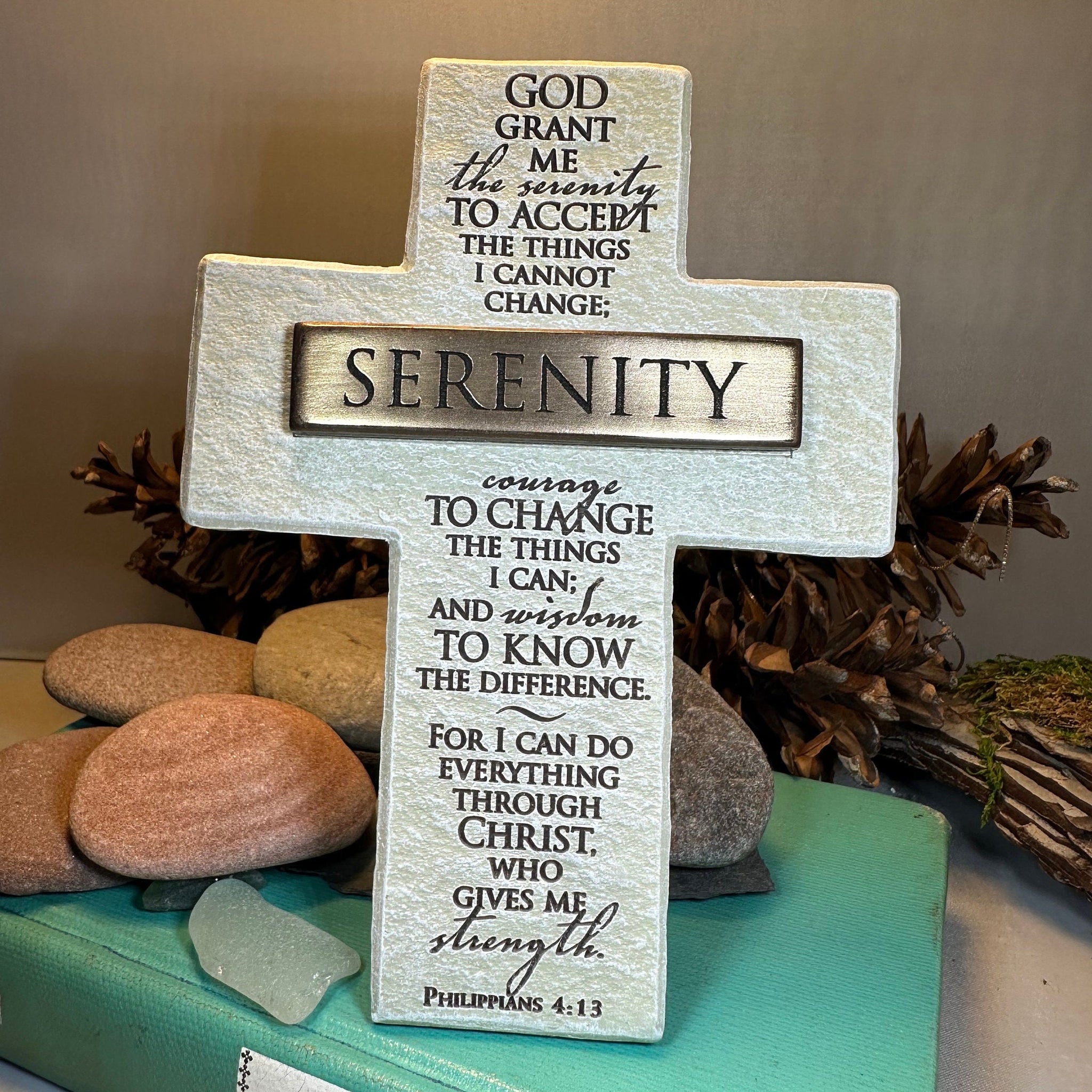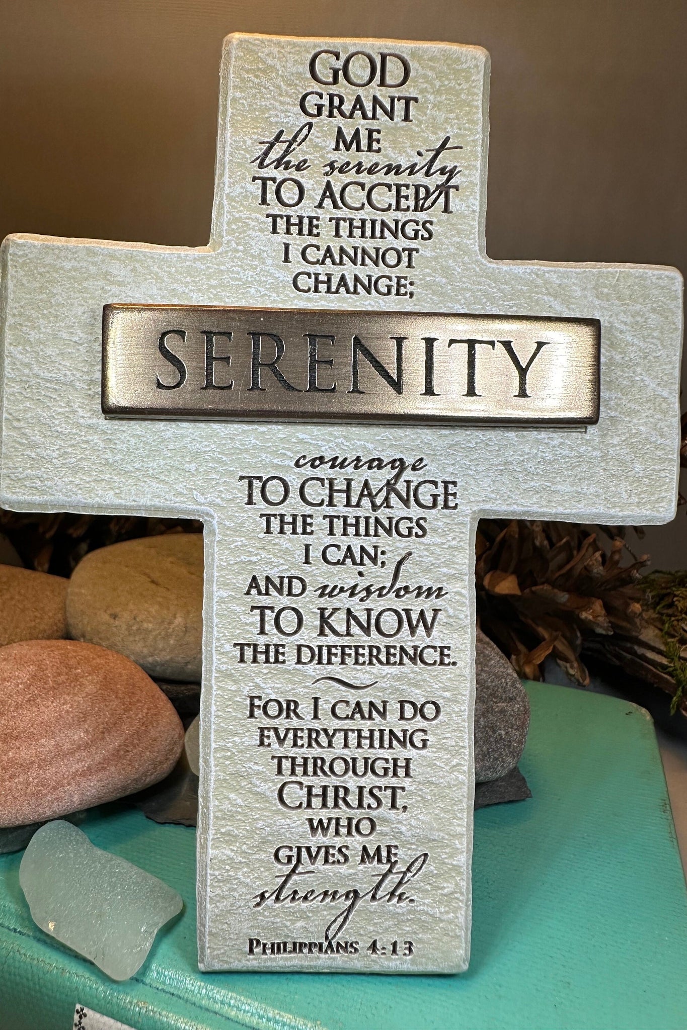 Cast resin with antique finish steel plate and Serenity blessing quote.