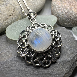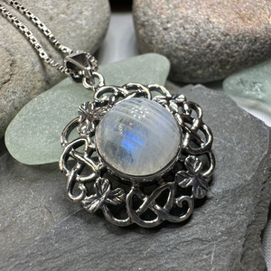 This Celtic Shamrock Moonstone pendant is handcrafted from sterling silver and will make a very meaningful gift for any loved one. The Celtic knot work surrounding the 4 carat moonstone stone means everlasting love... entwined with four Irish shamrocks, the symbol that is a perfect representation of your love, affection and heritage.