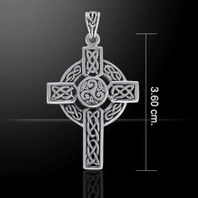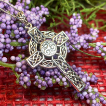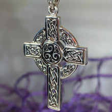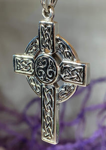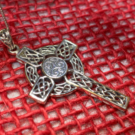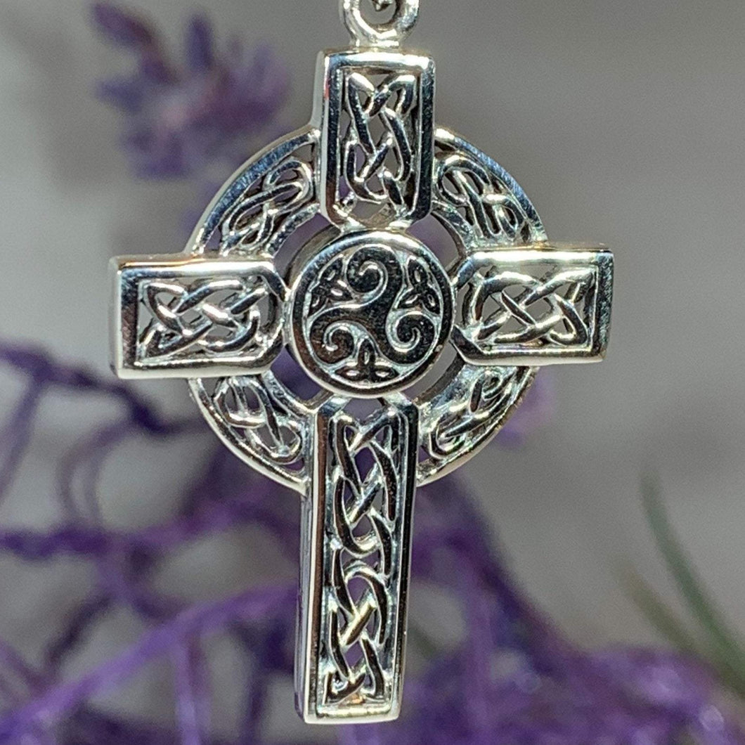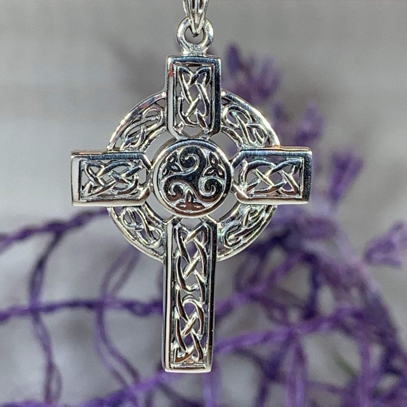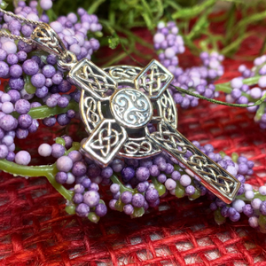 The Aileran Celtic Cross Necklace is an exquisite handmade piece that artfully combines the intricate Celtic weave with the timeless triple spiral motif.