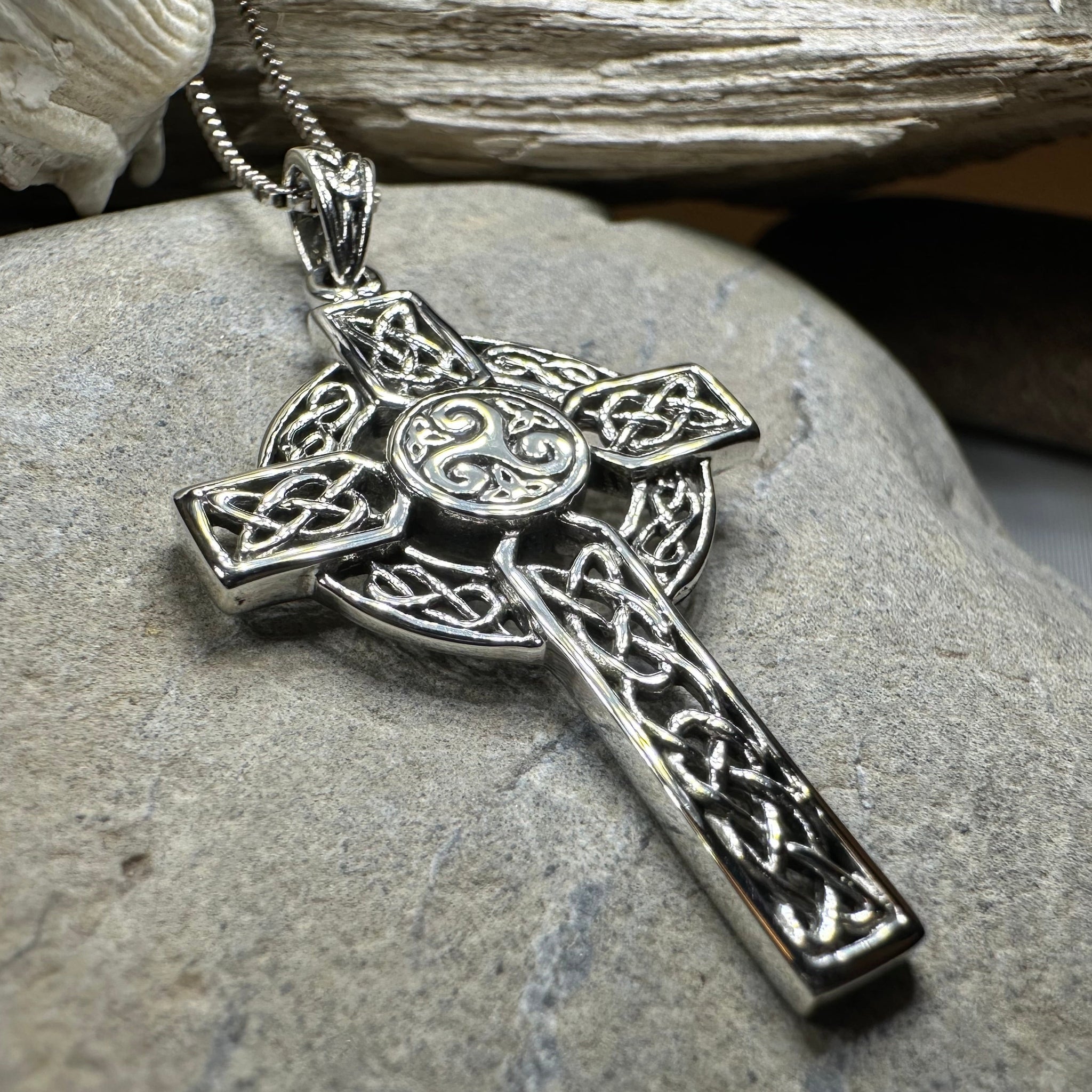 The Aileran Celtic Cross Necklace is an exquisite handmade piece that artfully combines the intricate Celtic weave with the timeless triple spiral motif.