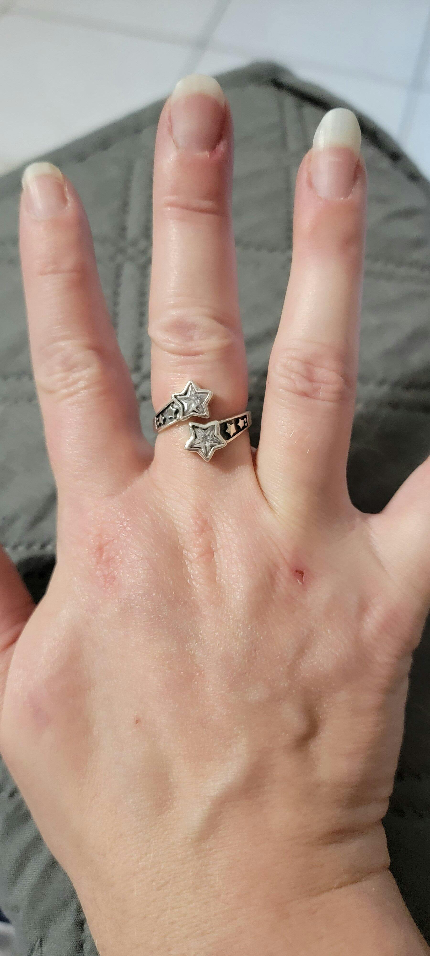 This Solid Sterling Silver Double Shooting Stars ring with a two star shaped diamond zirconia stones (3/4 carat each stone). The ring is adorned with an intricate celestial design that goes down the sides of the finger - an artful rendition of the traditional design.