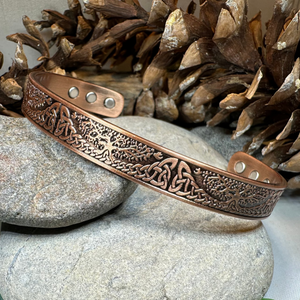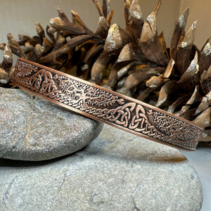 Stunning! Our handmade artisan Copper Celtic Tree of Life Bracelet features an ancient tree center design combined with traditional Celtic knot work. Celtic knot designs go back thousands of years and symbolize never ending love. Finished with clear lacquer to prevent tarnish this bracelet will never need polishing - making this bracelet the perfect gift for your loved one!