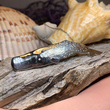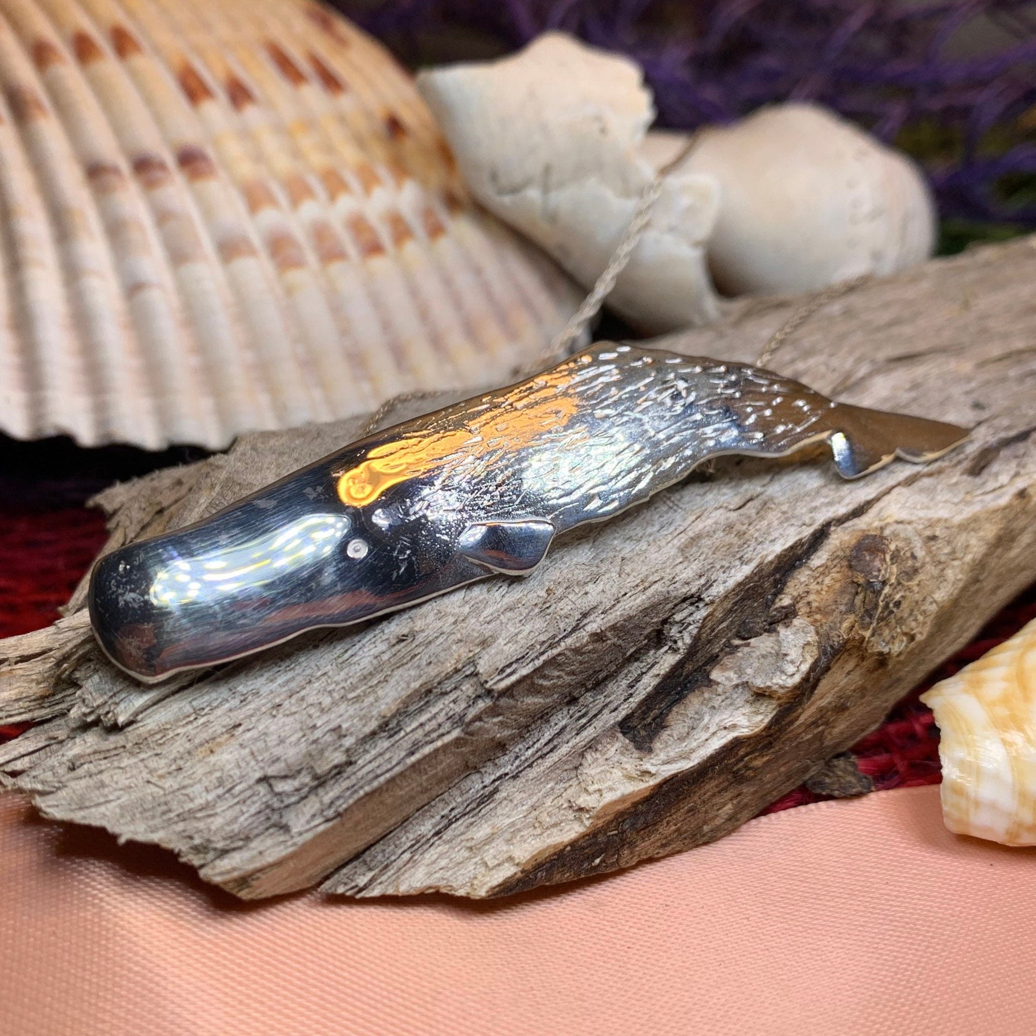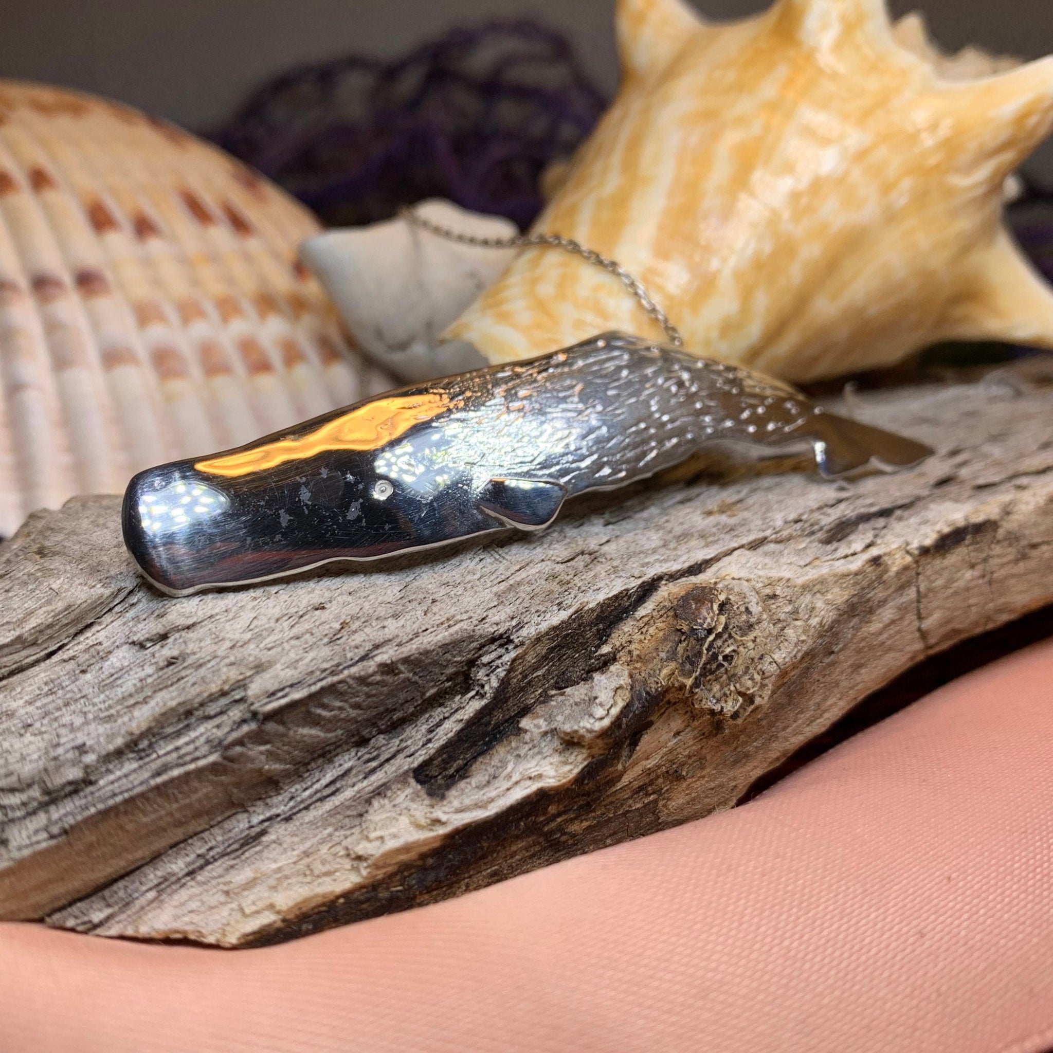 A lovely sterling silver whale 2 3/4" x 1/2" pendant on an 18" sterling silver chain.