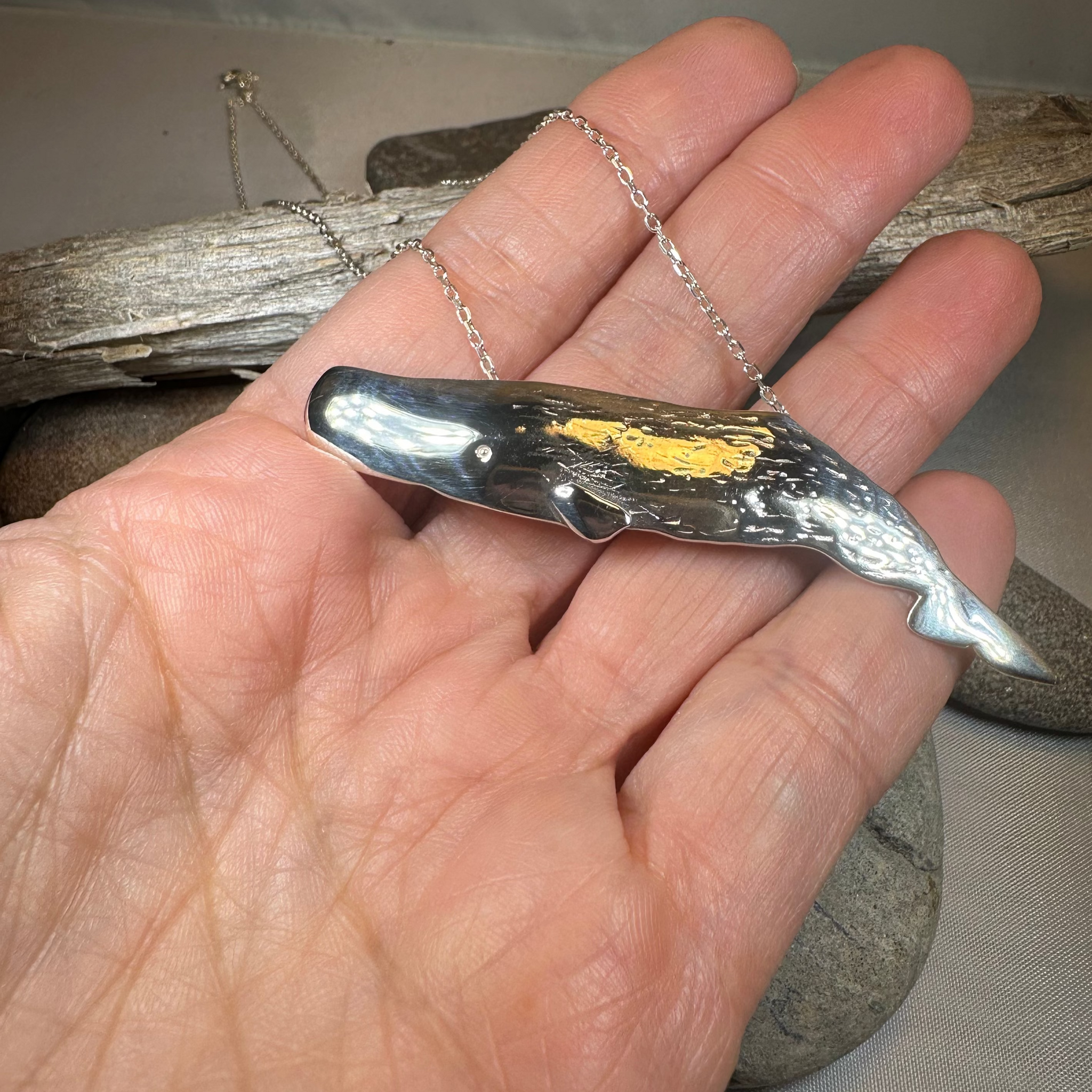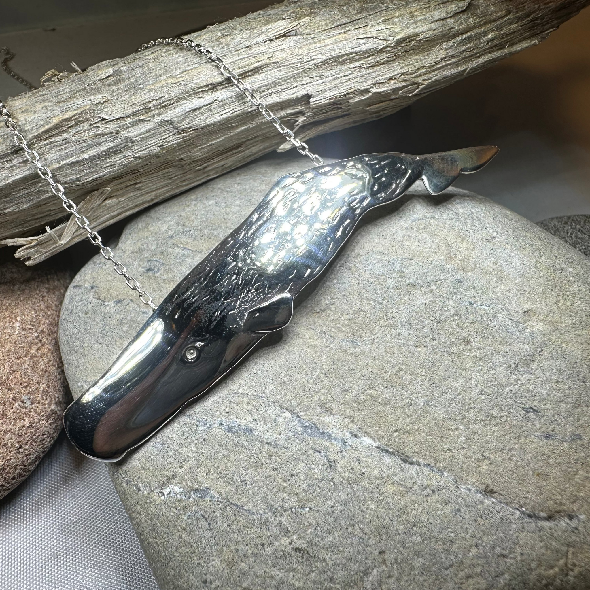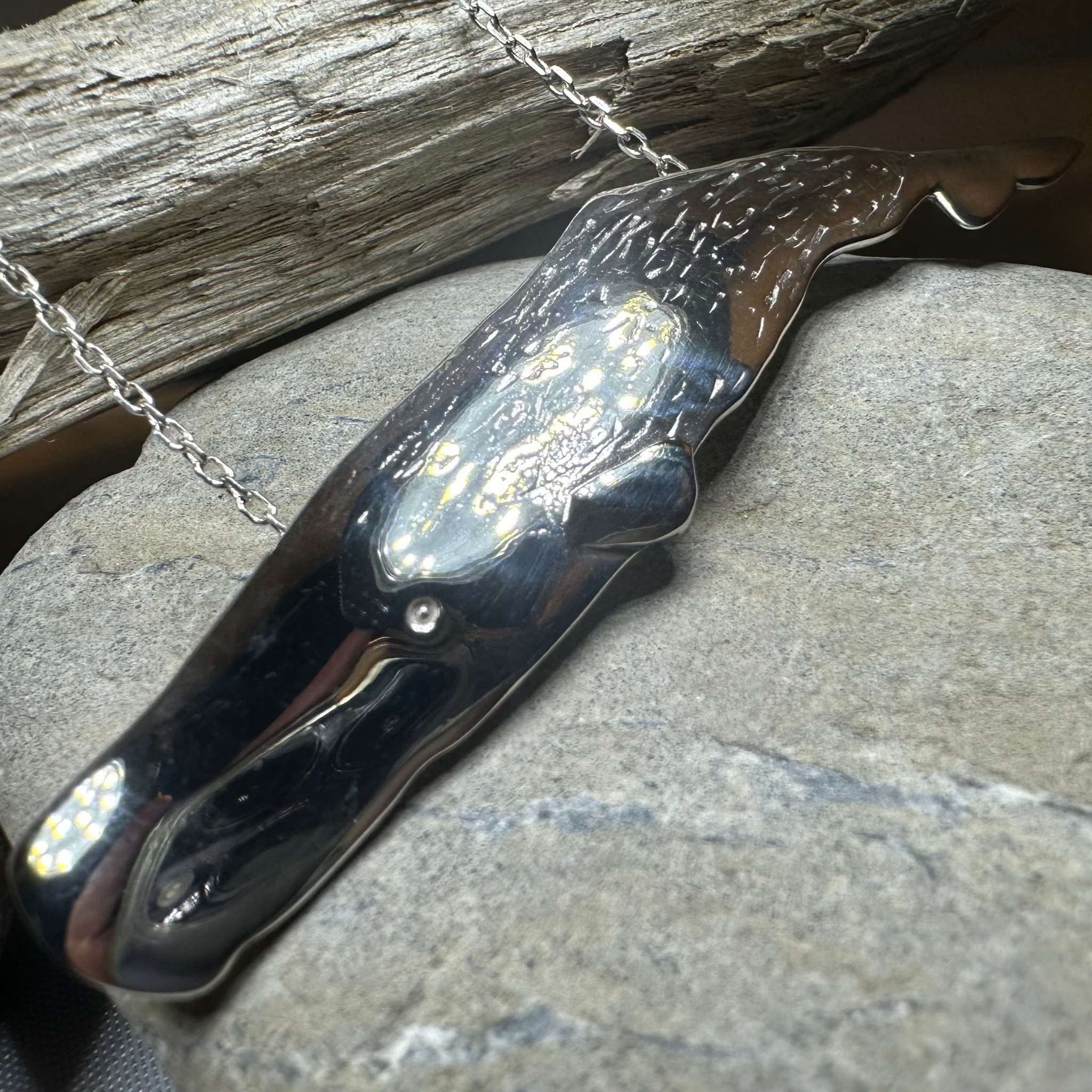 A lovely sterling silver whale 2 3/4" x 1/2" pendant on an 18" sterling silver chain.