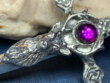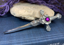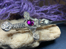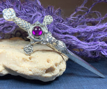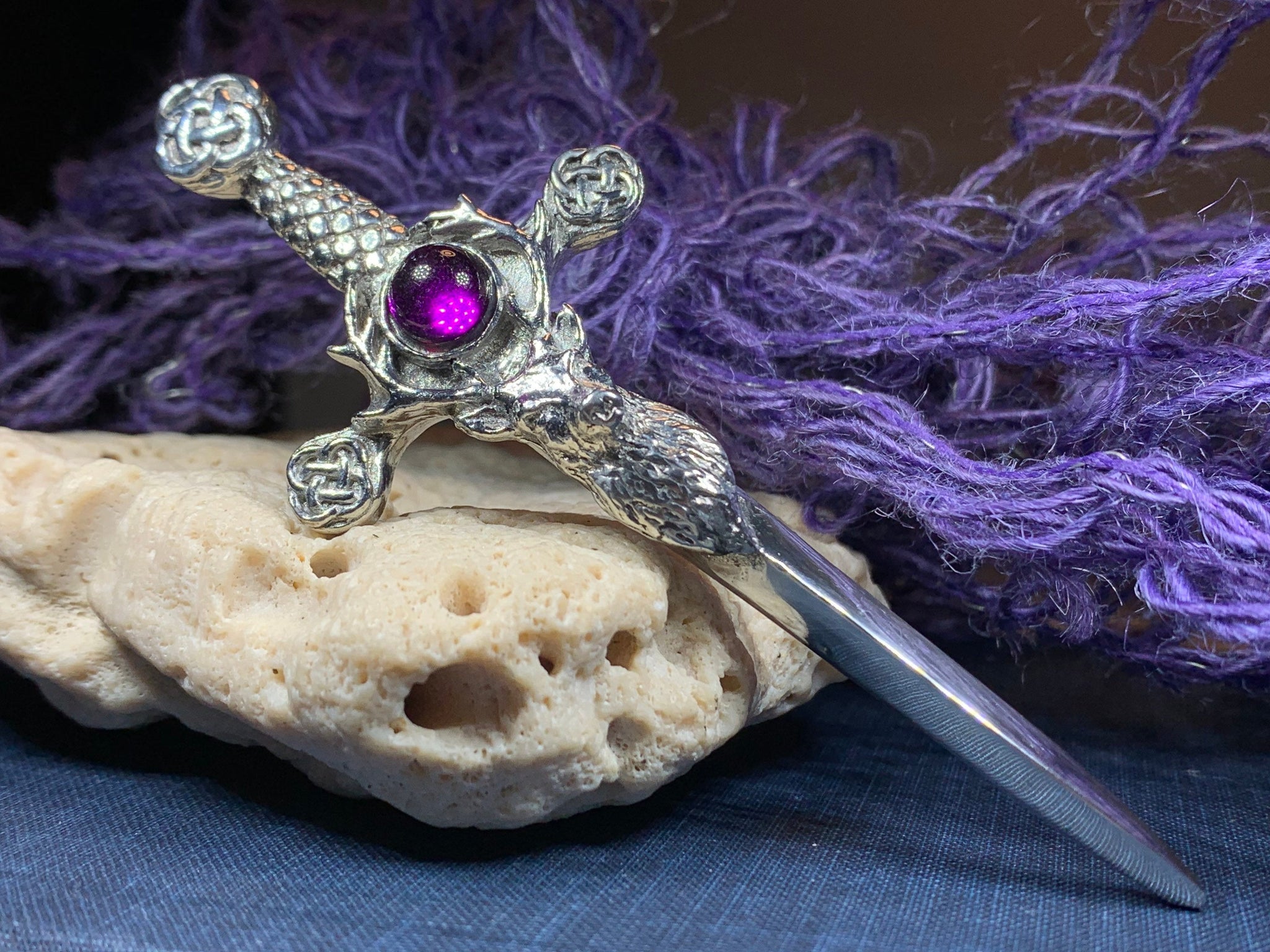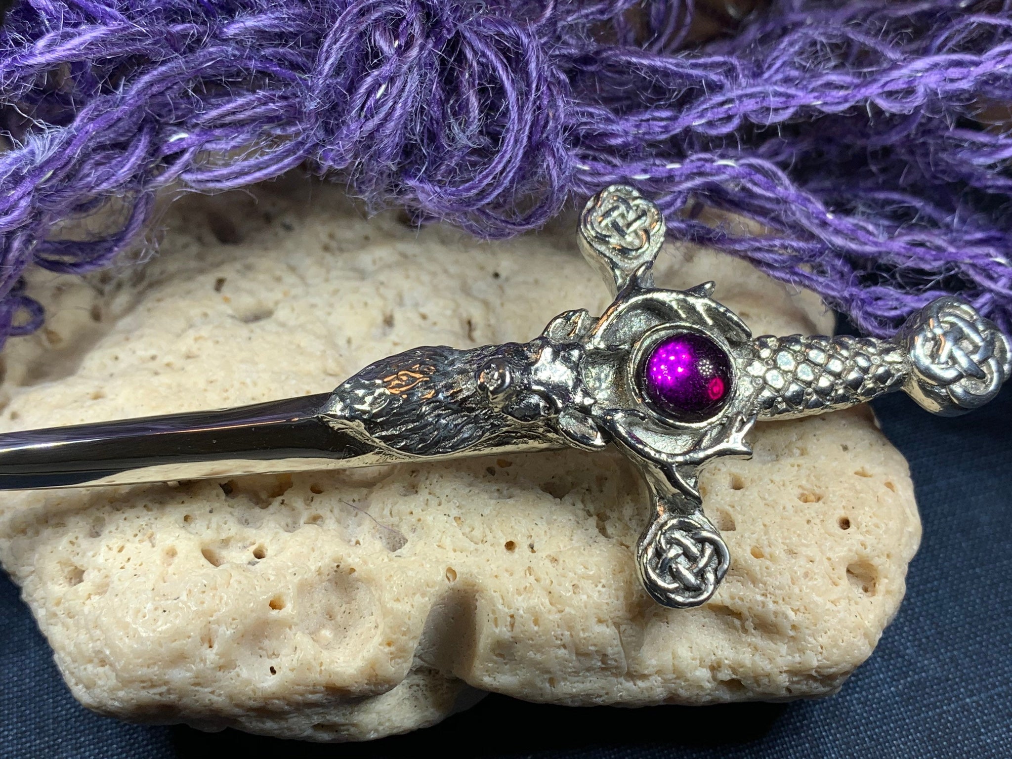 A truly beautiful kilt pin with a purple (almost 1/4 inch in diameter). This sword features an elaborate stag's head with majestic horns reaching toward the hilt of the sword, all in highly polished pewter.