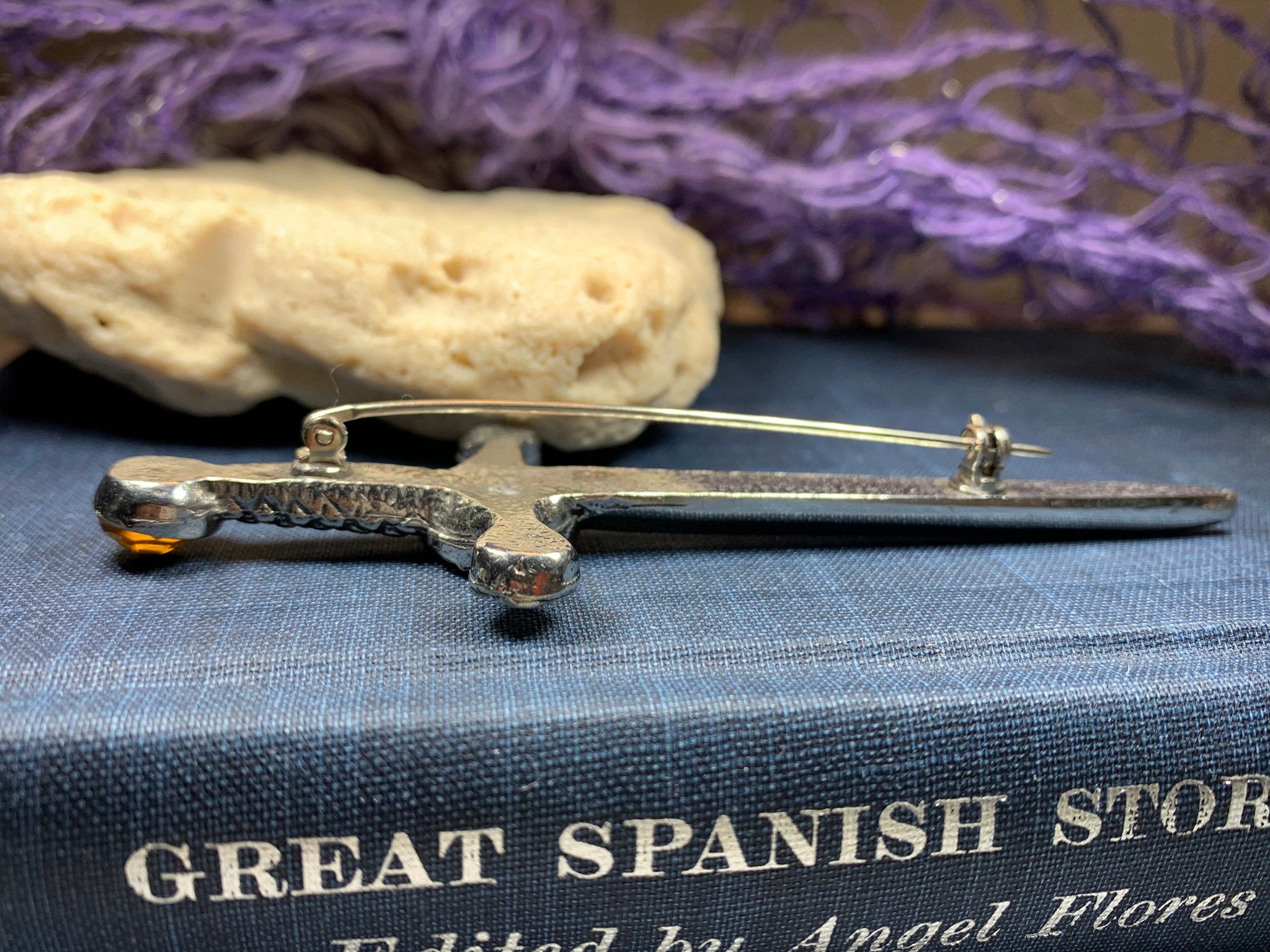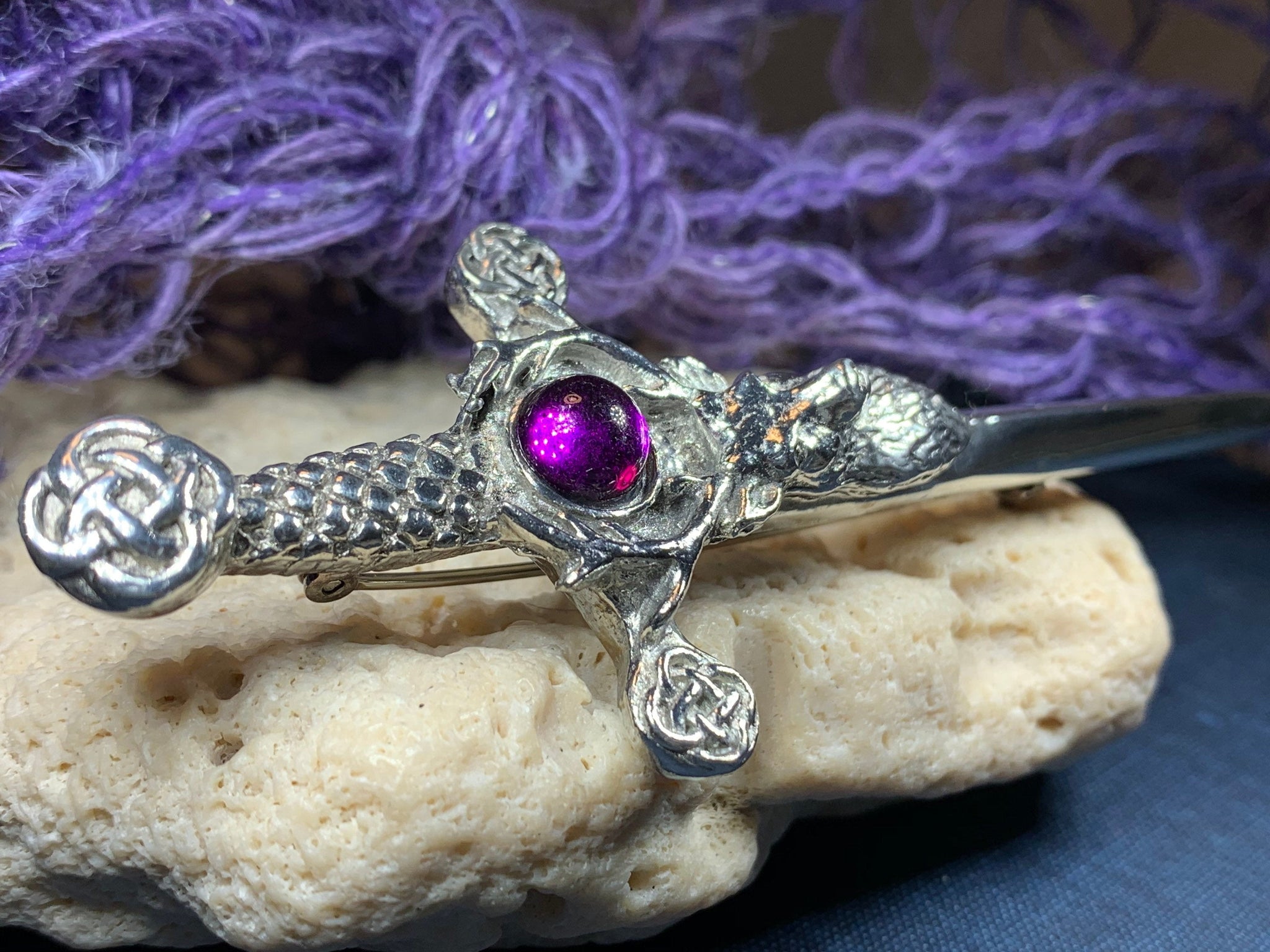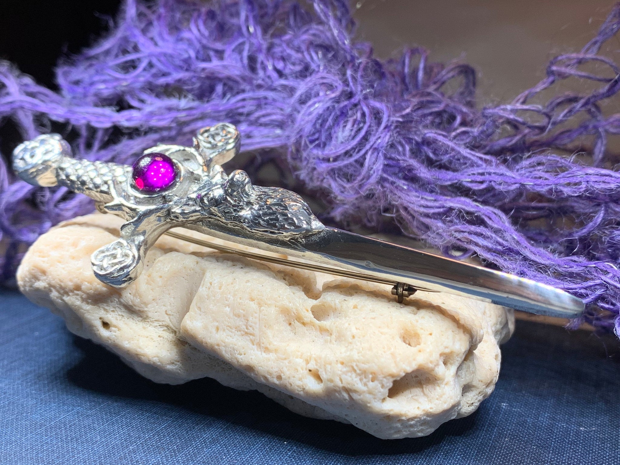 Unleash your inner warrior with the Stag Sword Kilt Pin! This stunning accessory boasts a regal purple gem, intricately detailed stag head, and shining pewter finish. A must-have for any highland gentleman looking to make a bold statement.