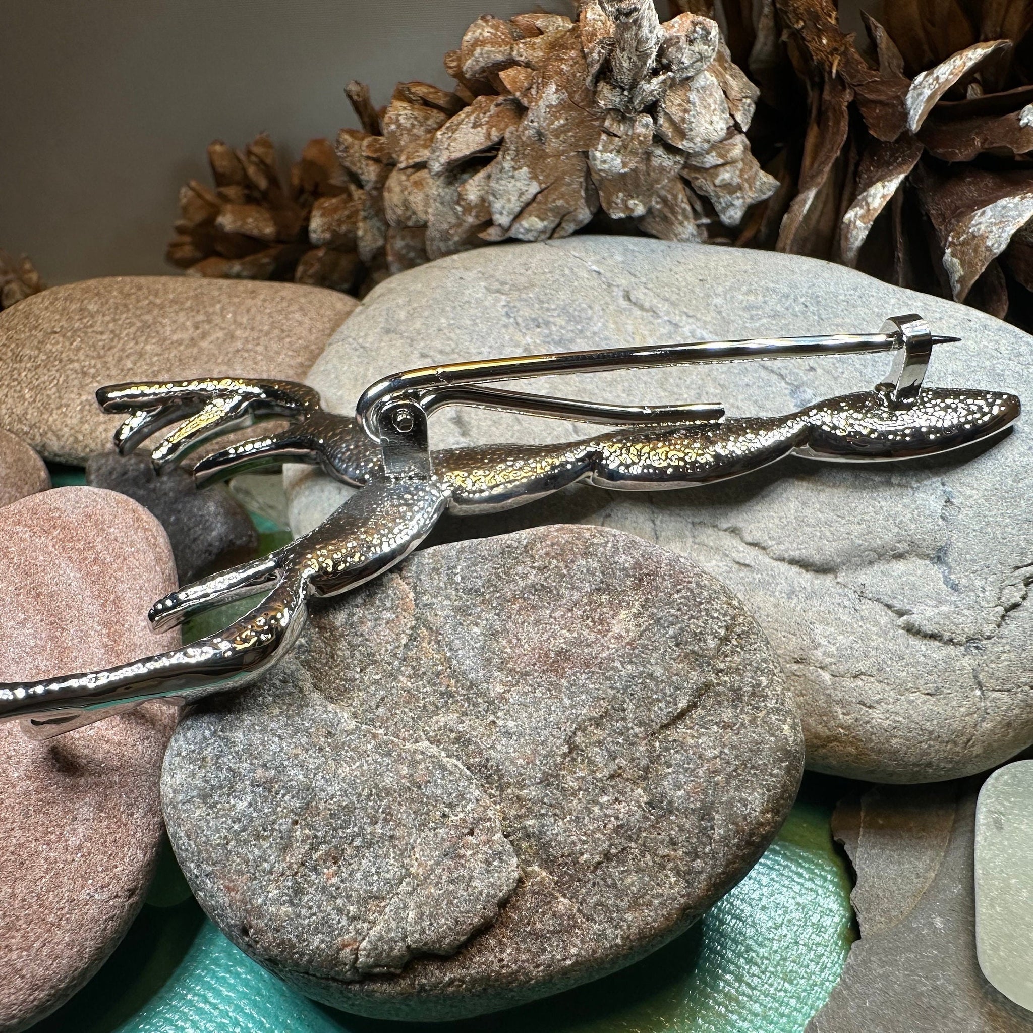 A truly beautiful kilt pin with a stylized Celtic stag with a large set of stag antlers! This pin features an elaborate stag's head with majestic horns reaching upwards, all in lead free polished pewter.