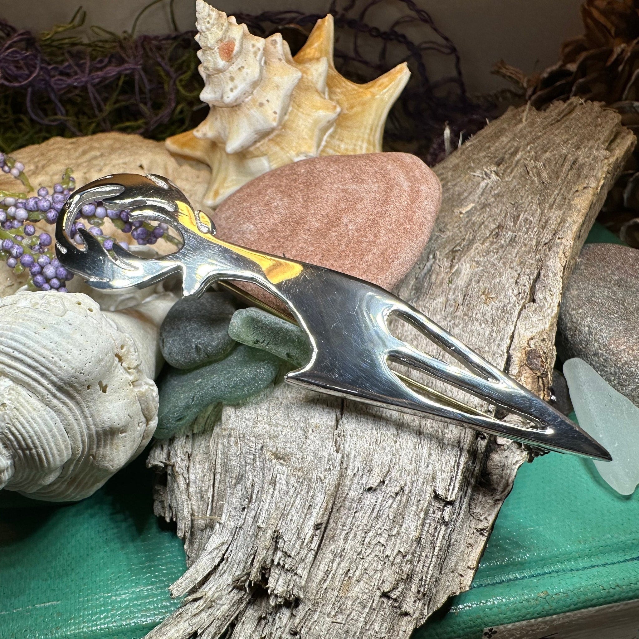 This pin features an elegant stag with majestic horns reaching upward, all in lead free polished pewter. Perfect for a kilt pin or just as a lovely brooch for any type of fabric.