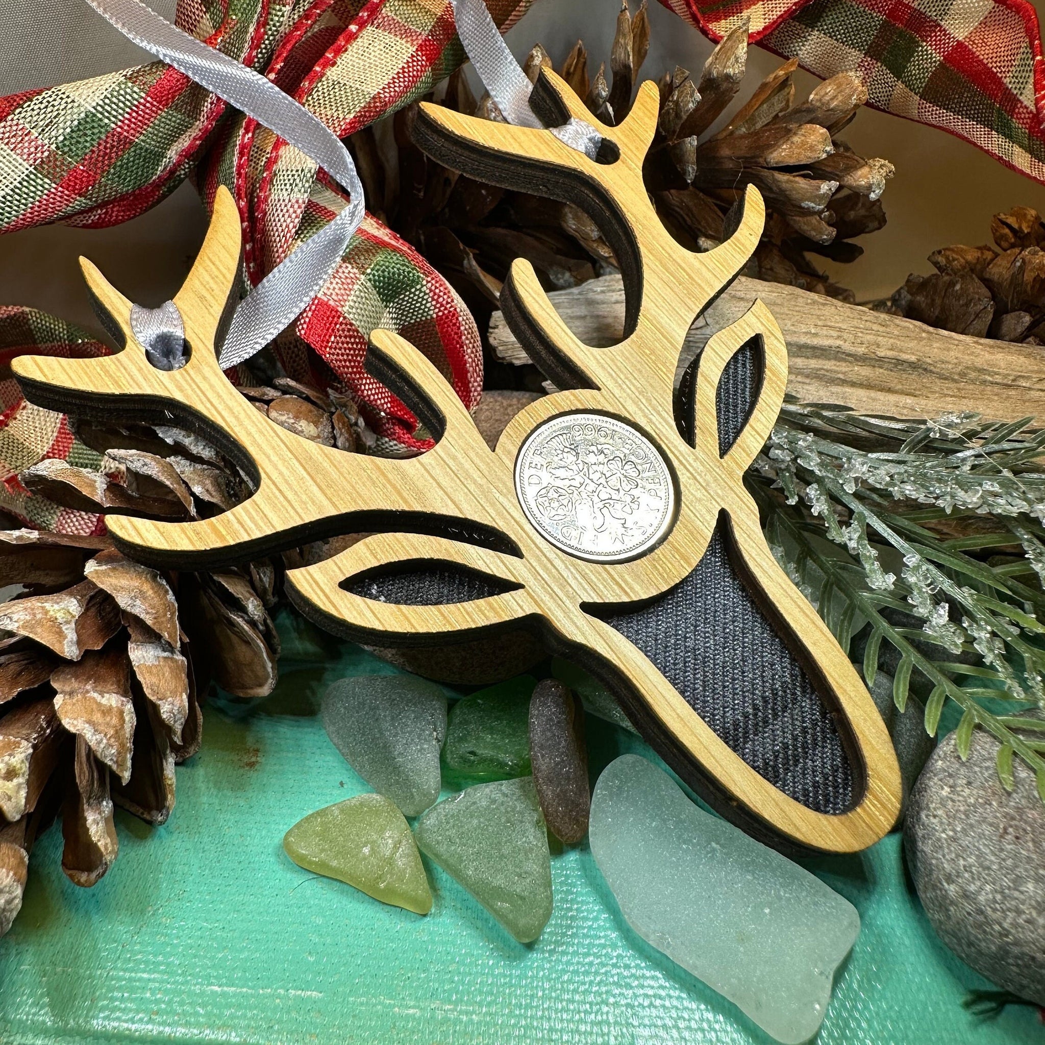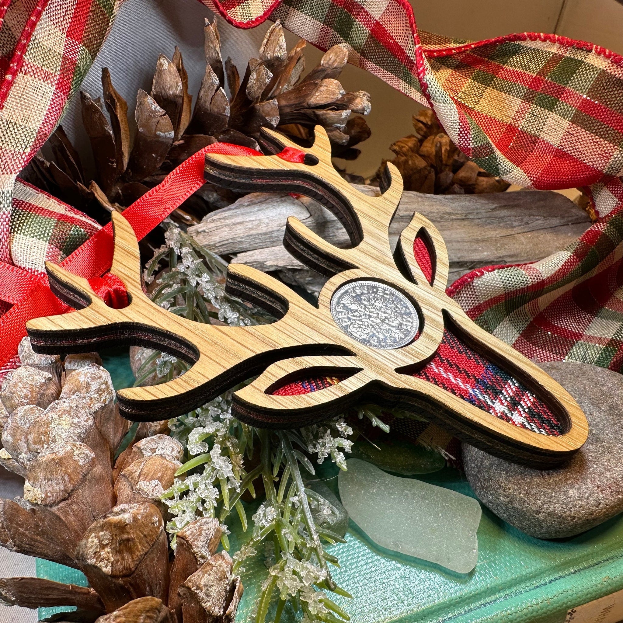 Tartan and oak wood Highland Stag Ornament that will make a beautiful addition to your holiday decor!