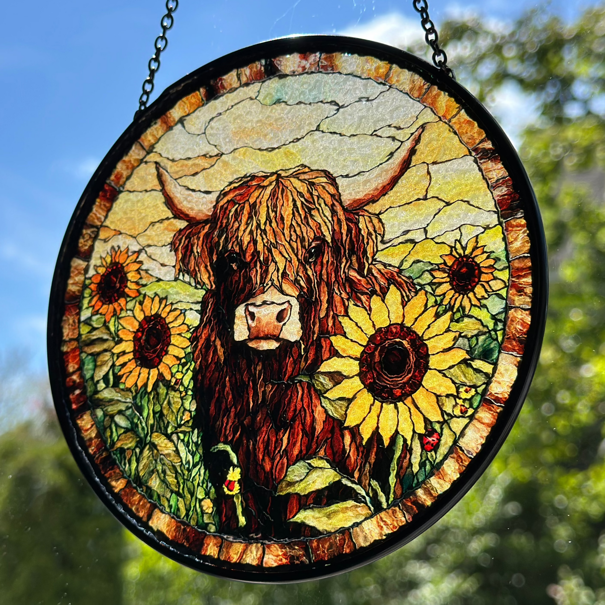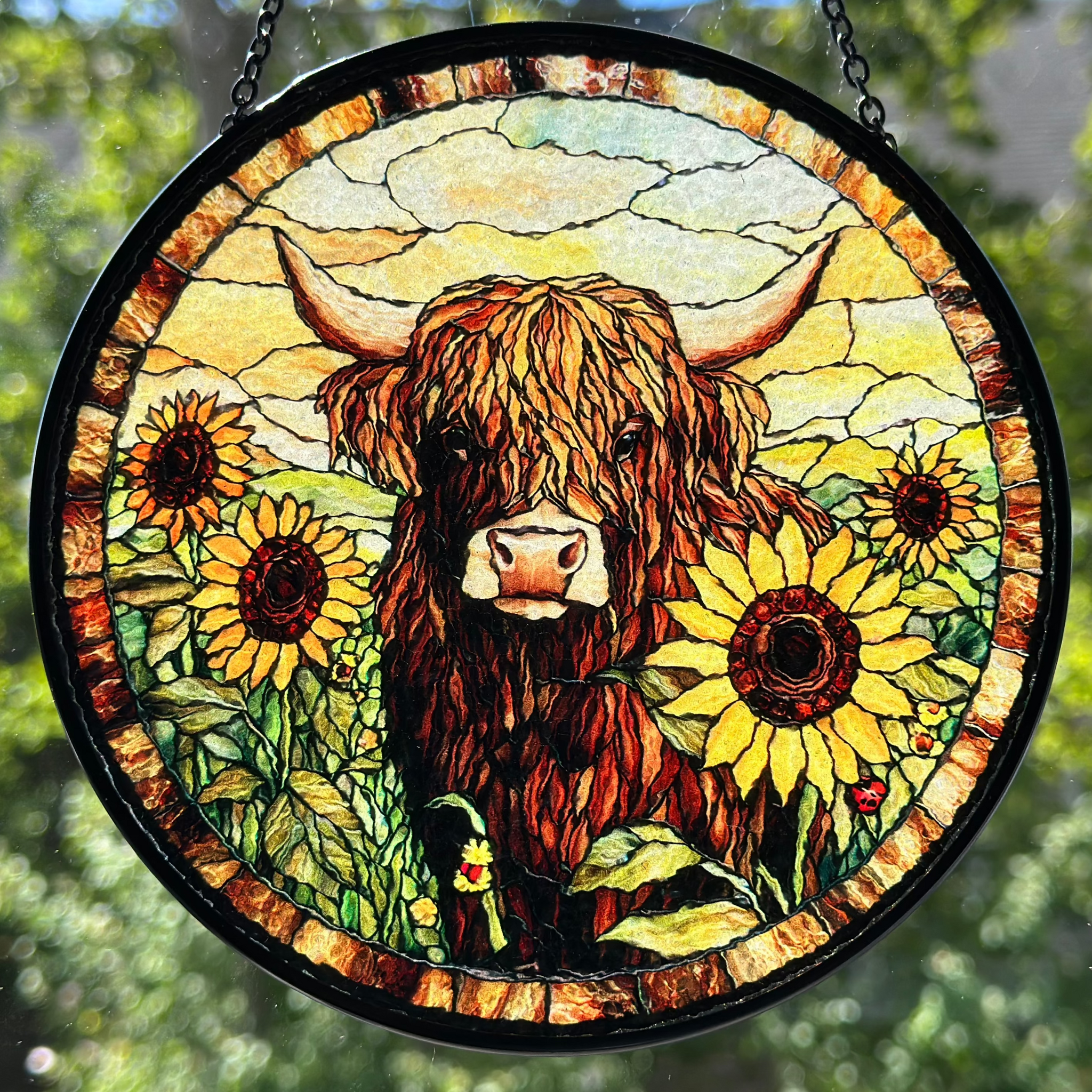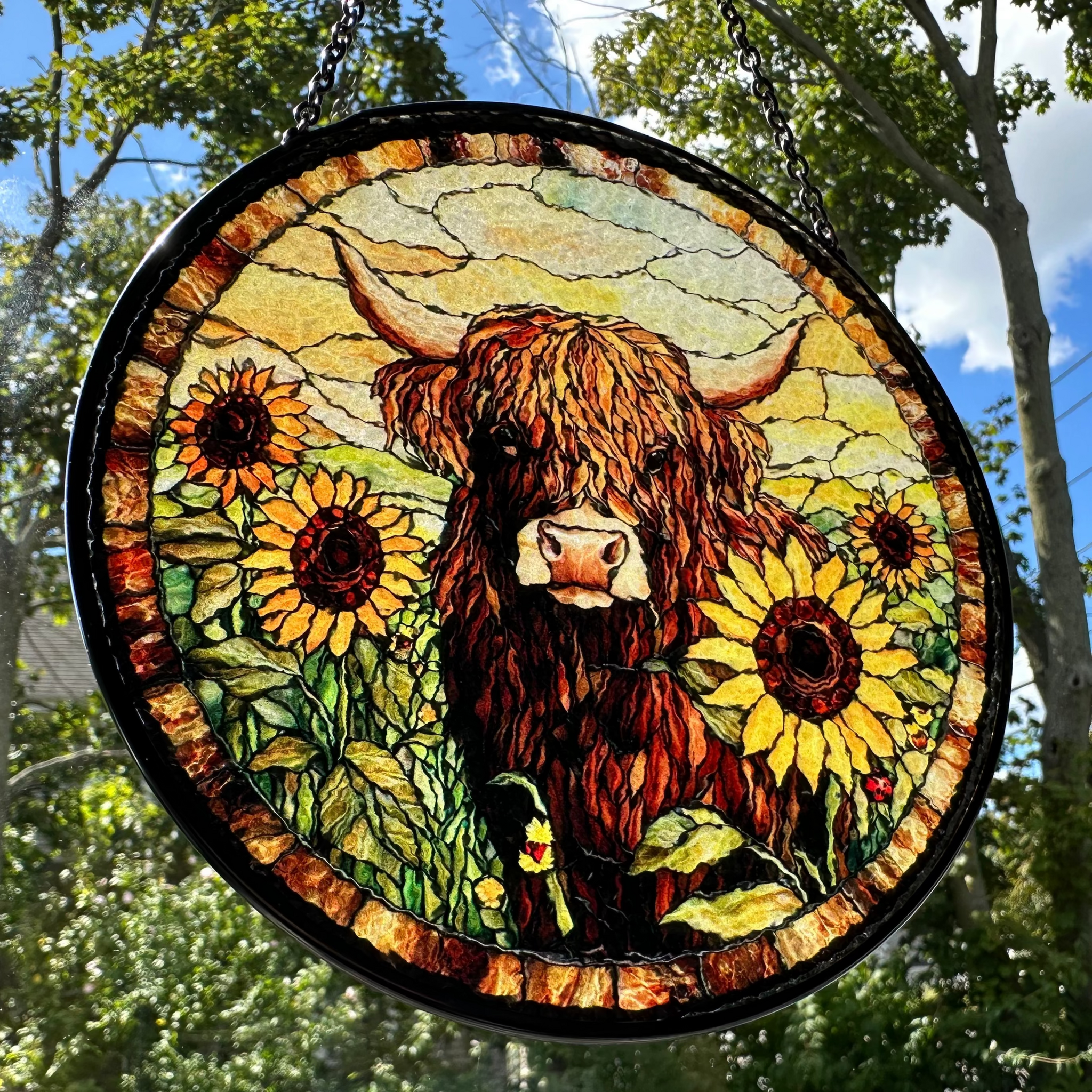 This Sunflower Highland Cow window art glows in beautiful colors. With vibrant colors and - a perfect and colorful scene that will bring you joy every time you see it!
