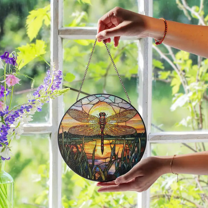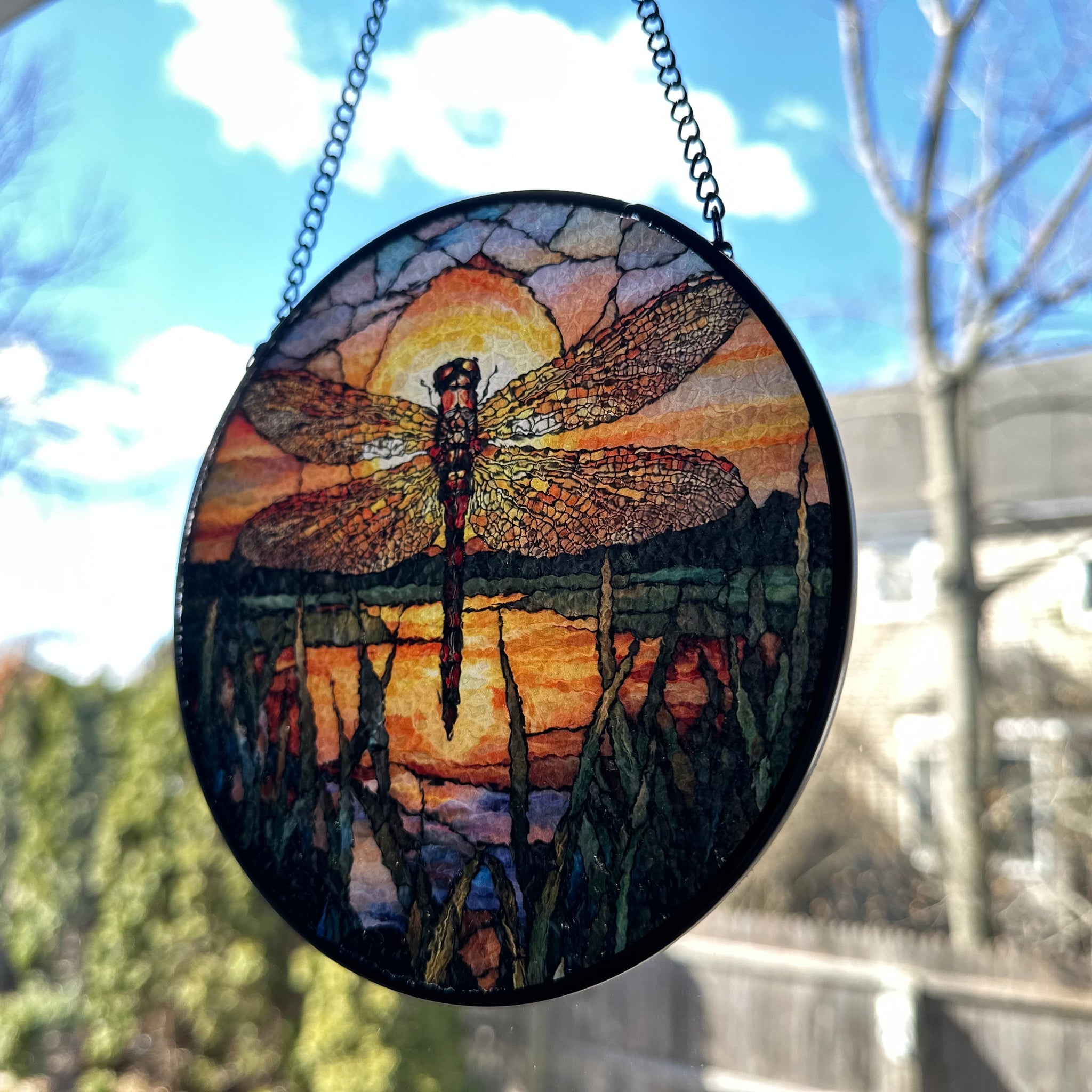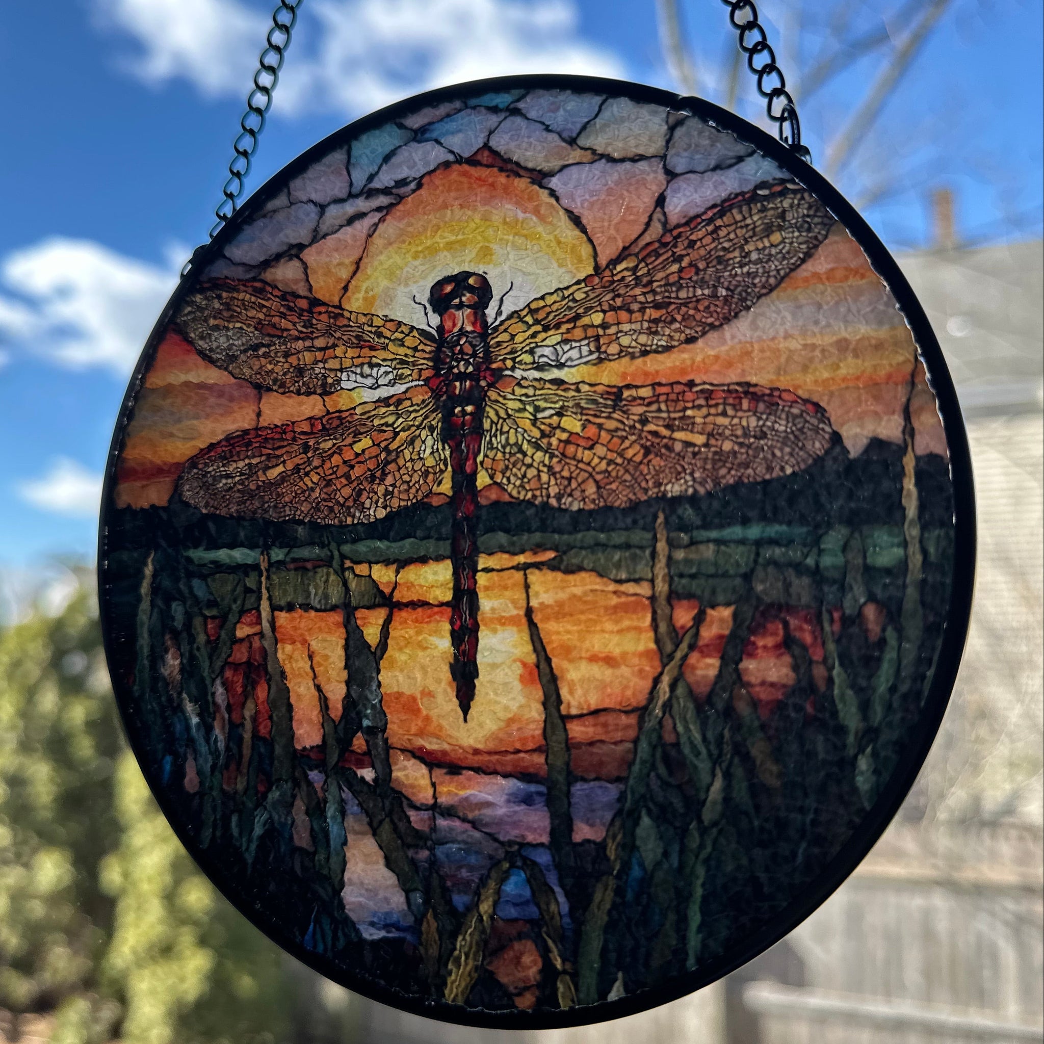 This Sunset Dragonfly window art glows in beautiful colors. With vibrant colors and - a perfect and colorful scene that will bring you joy every time you see it!