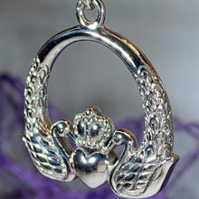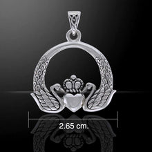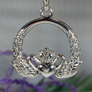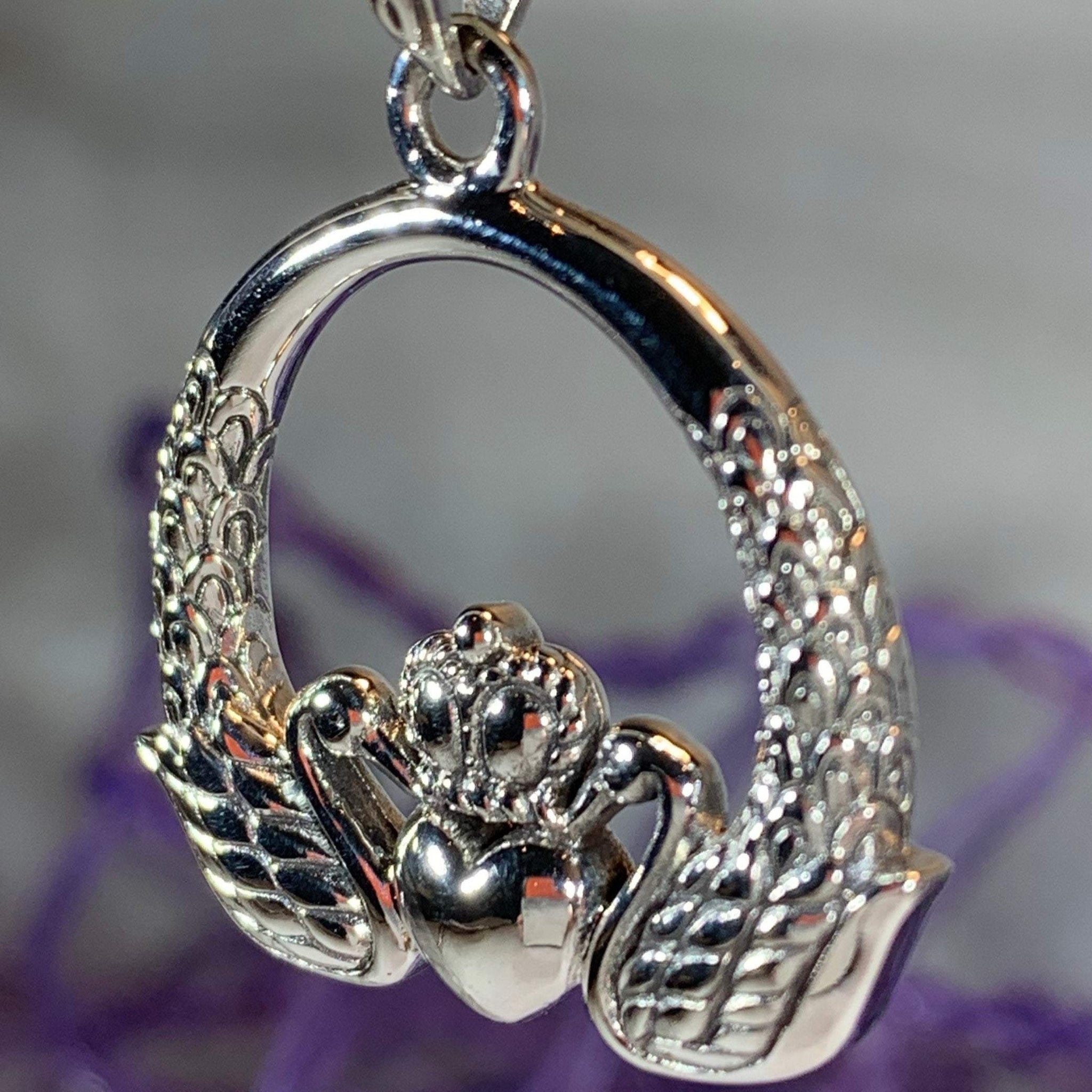 This is no ordinary Claddagh - this beautiful piece has intricate knotwork surrounding and elaborate Claddagh designed from two swans with their necks holding a heart shape and with a detailed crown - you can see the little crown details. The swans even have tiny feathers!