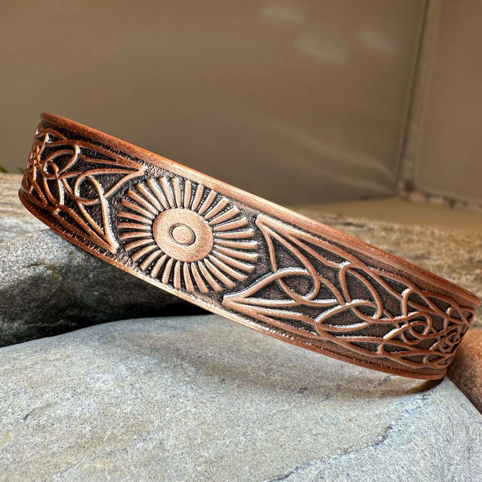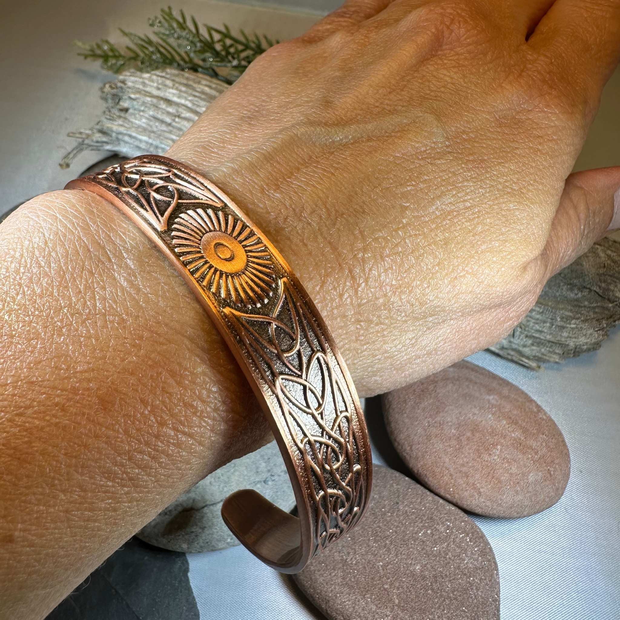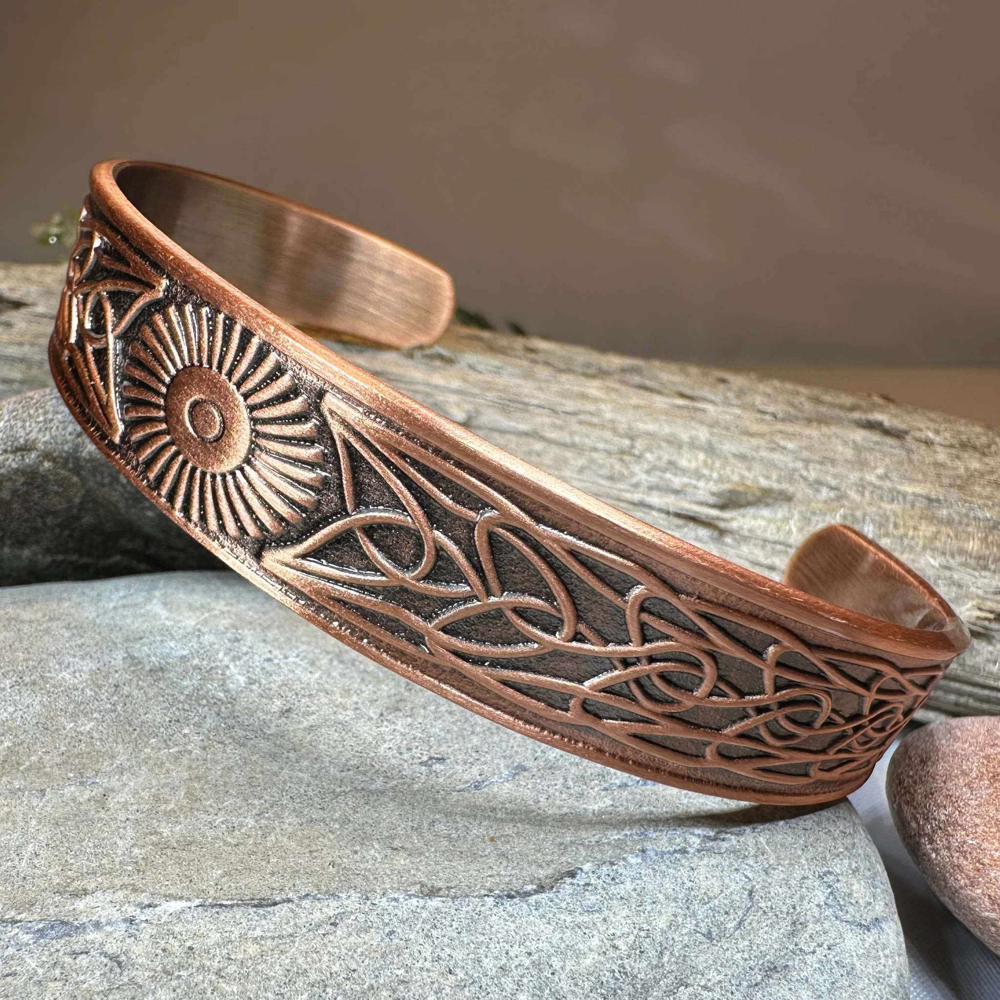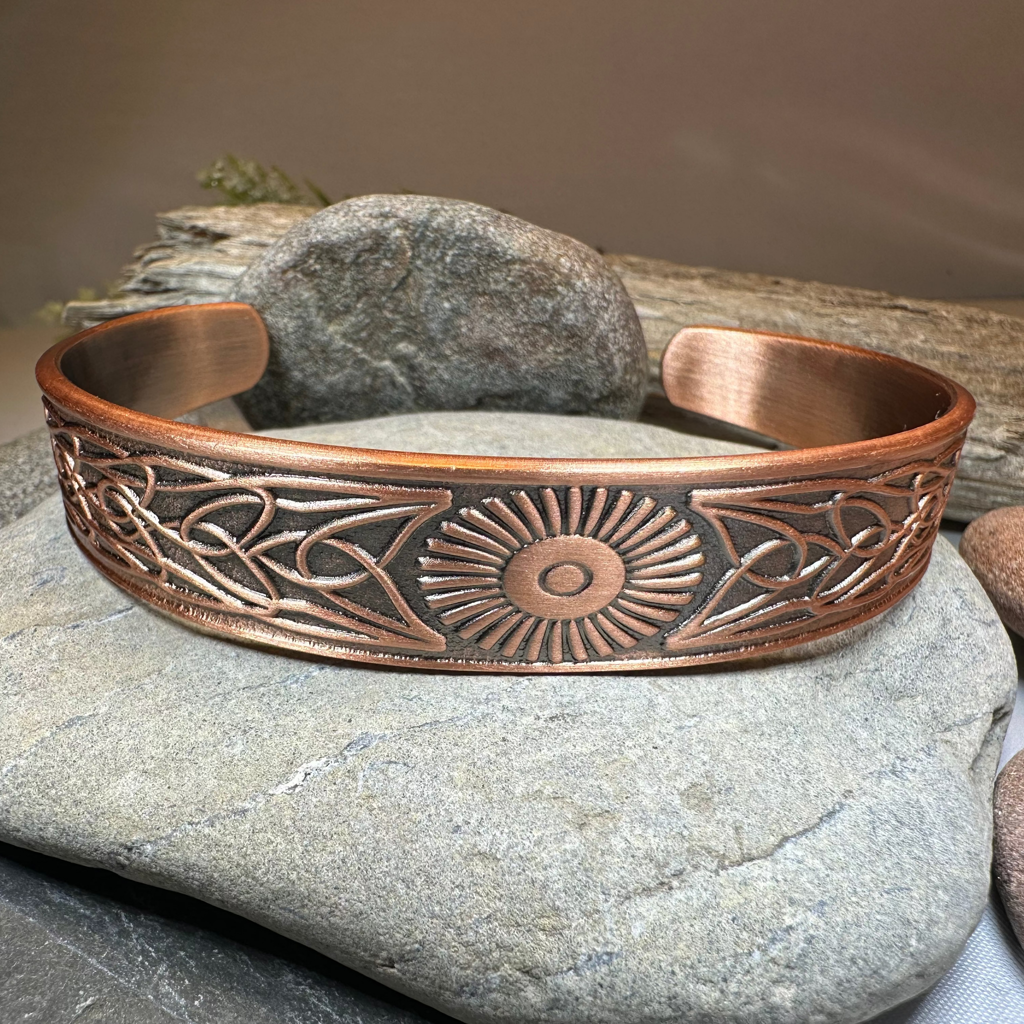 This bangle is embraced on both sides by a Celtic knot work pattern. Made of heavy, solid copper that will never tarnish and designed to last a lifetime. A beautiful gift!