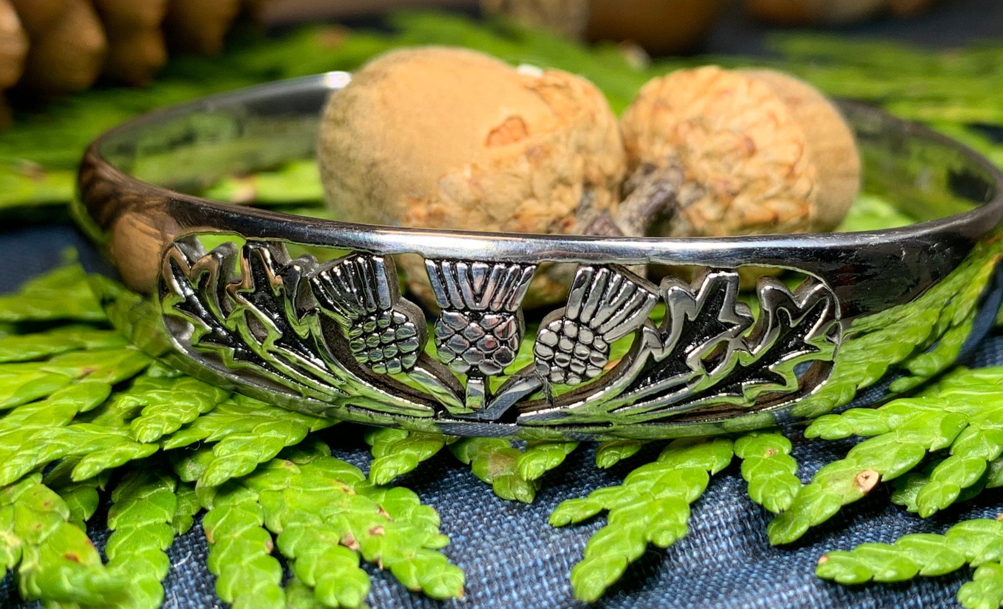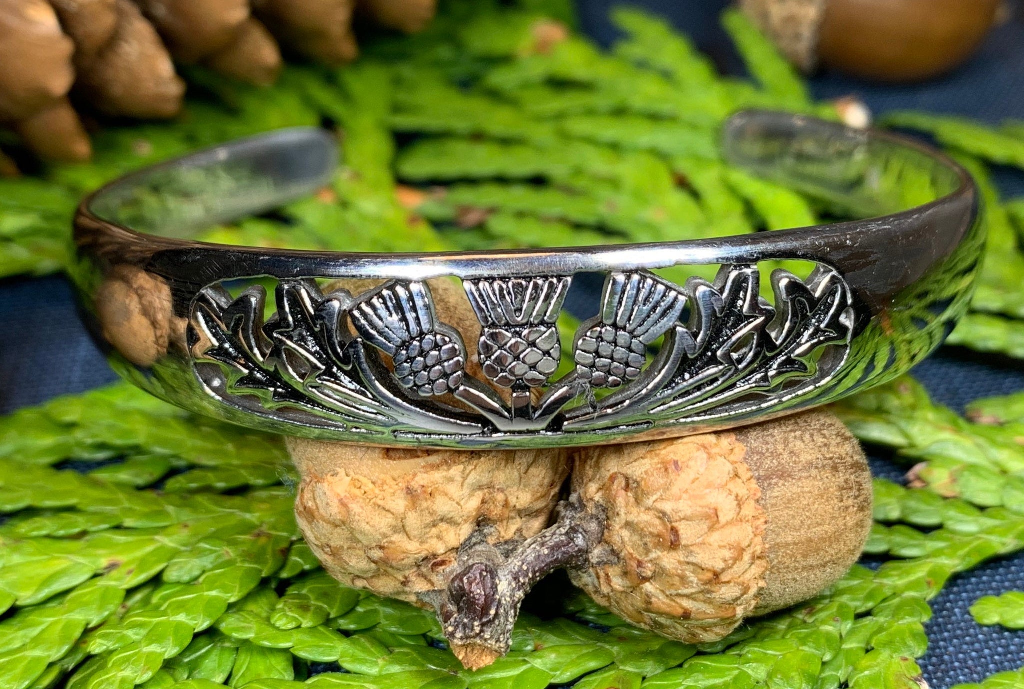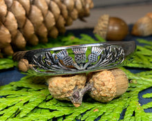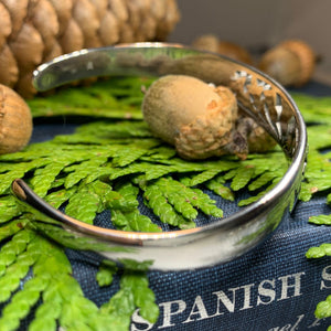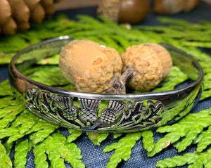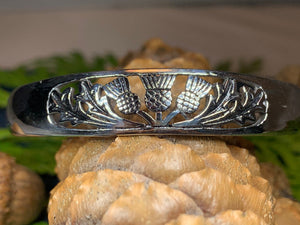 Stunning! Our highly polished Pewter Thistle Bangle Bracelet features three thistles with leaves in a cut-out design. Made of heavy, solid pewter that will never tarnish and designed to last a lifetime. A beautiful gift!