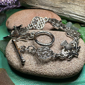Stunning! Our highly polished lead free pewter Scottish Thistle Bracelet features the eight beautiful Thistles, embraced on both sides by detailed leaves.