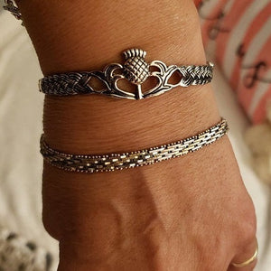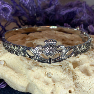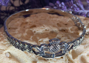 Stunning! Our highly polished Pewter Scottish Thistle Bangle Bracelet features the beautiful Thistle, embraced on both sides by approximately 5/8" of a braided Celtic knot-work pattern which is defined by light antiquing. The remainder of the bangle is sleek and unadorned.