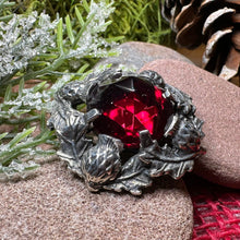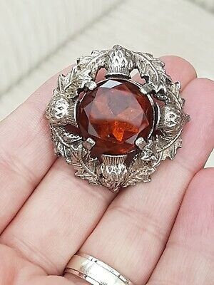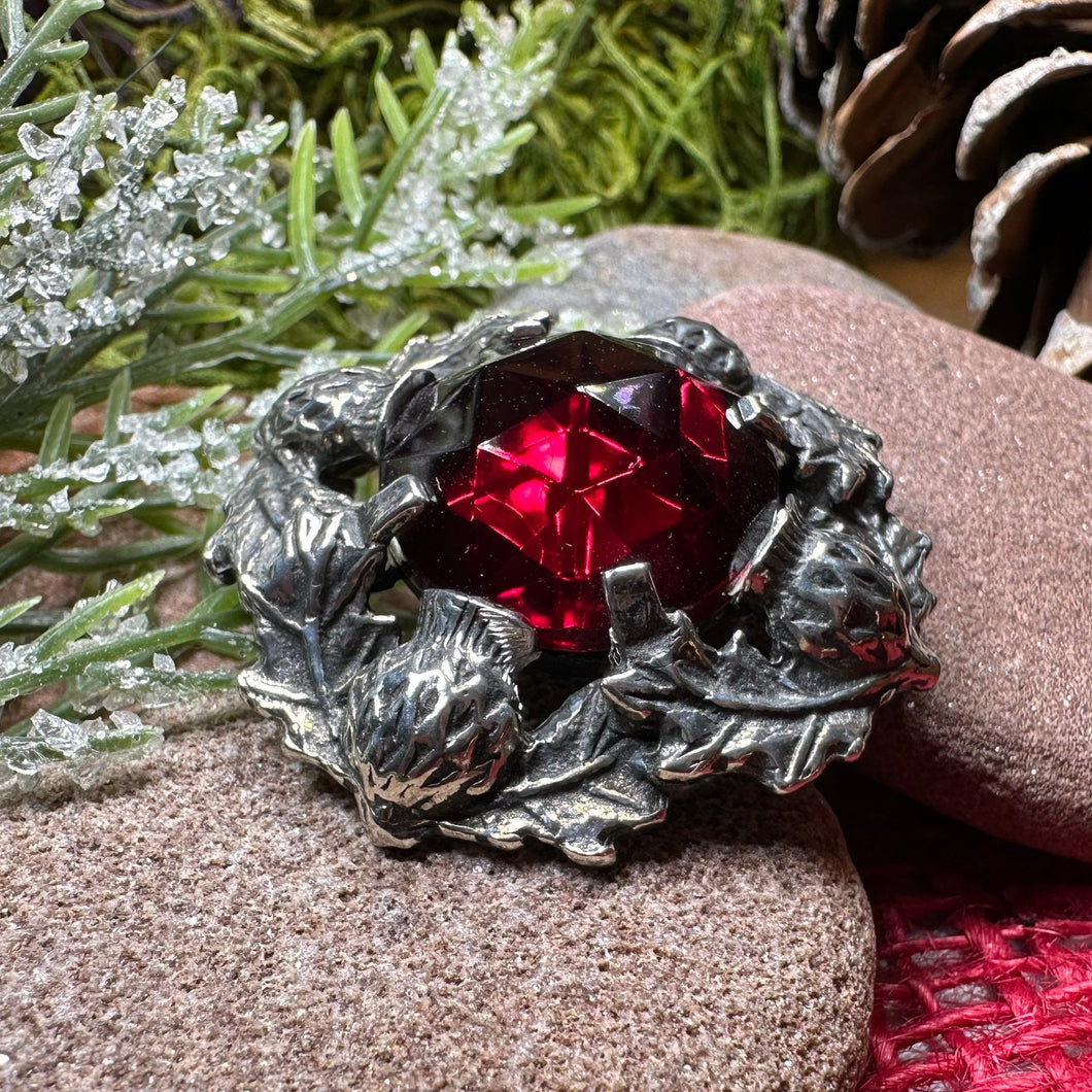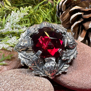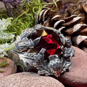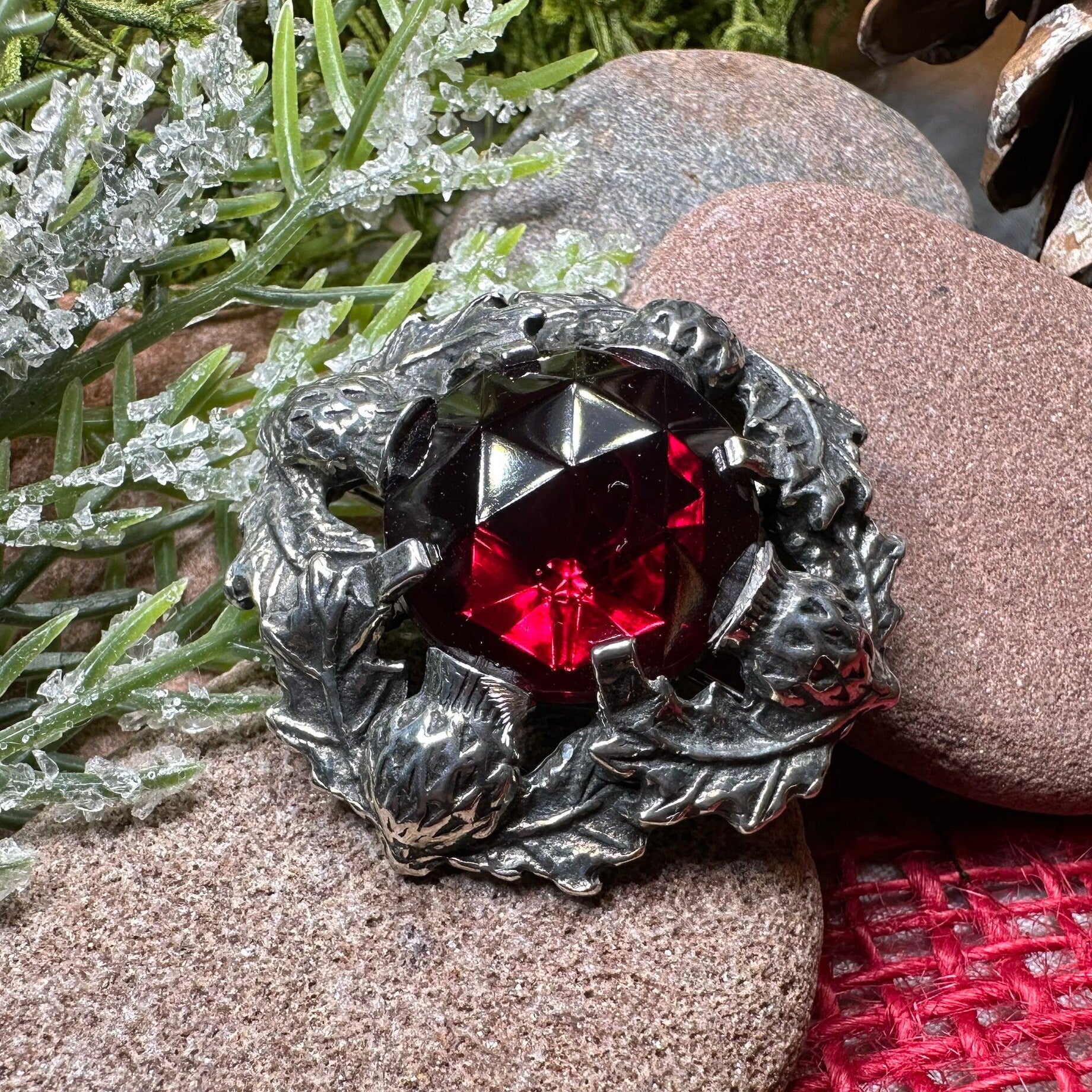 Large solid pewter tartan pin features the traditional penannular style with raised Celtic knotwork and five realistic thistles. Secures to a garment by way of a 3 inch steel pin with locking, safety catch - soldered to the pewter frontpiece for strength.