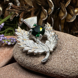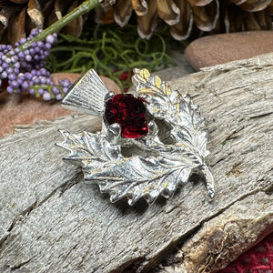 Crystal Celtic Thistle brooch – a sterling silver plated pewter shoulder style brooch that has a faceted accent crystal in your choice of color (purple, green or red).
