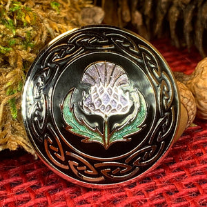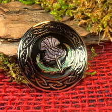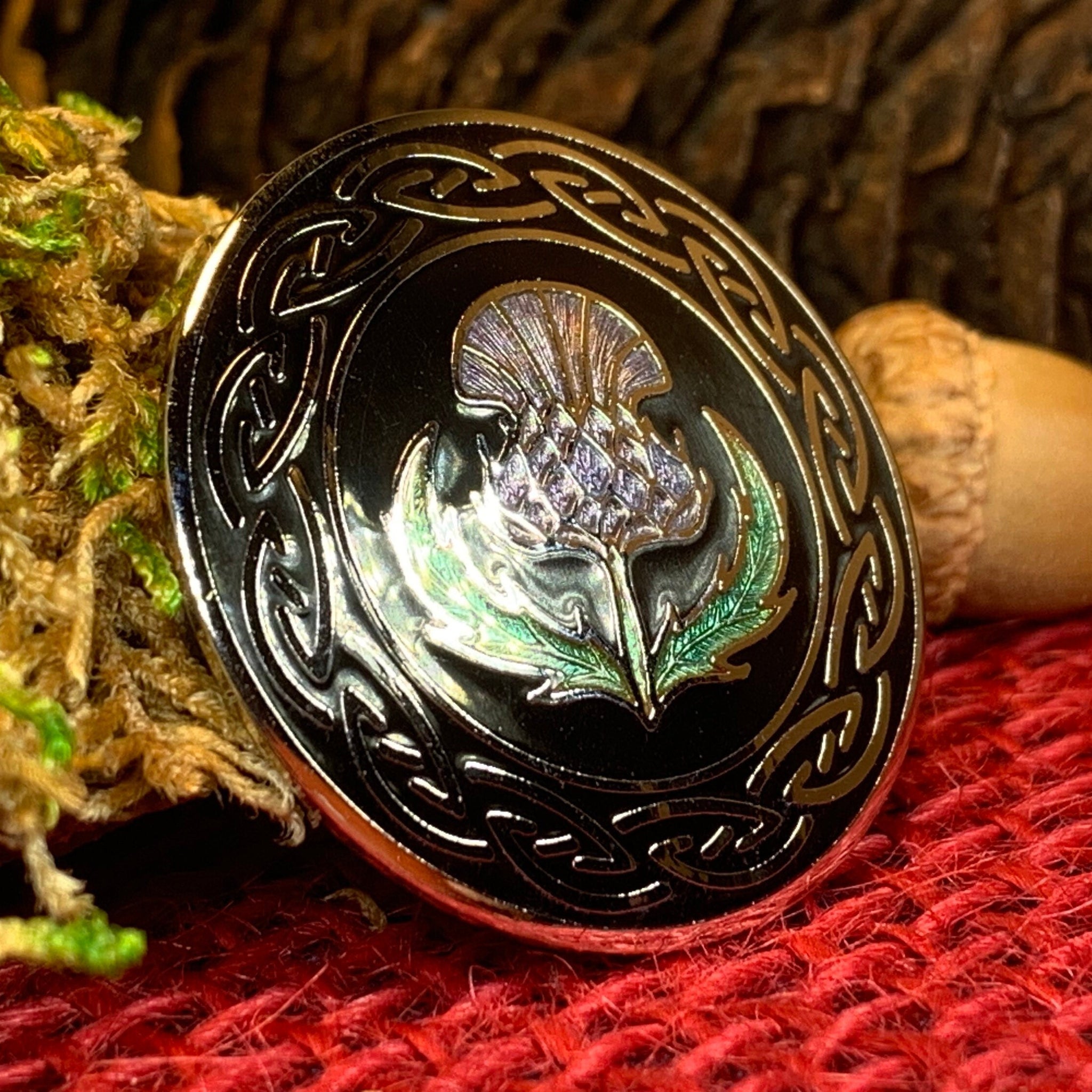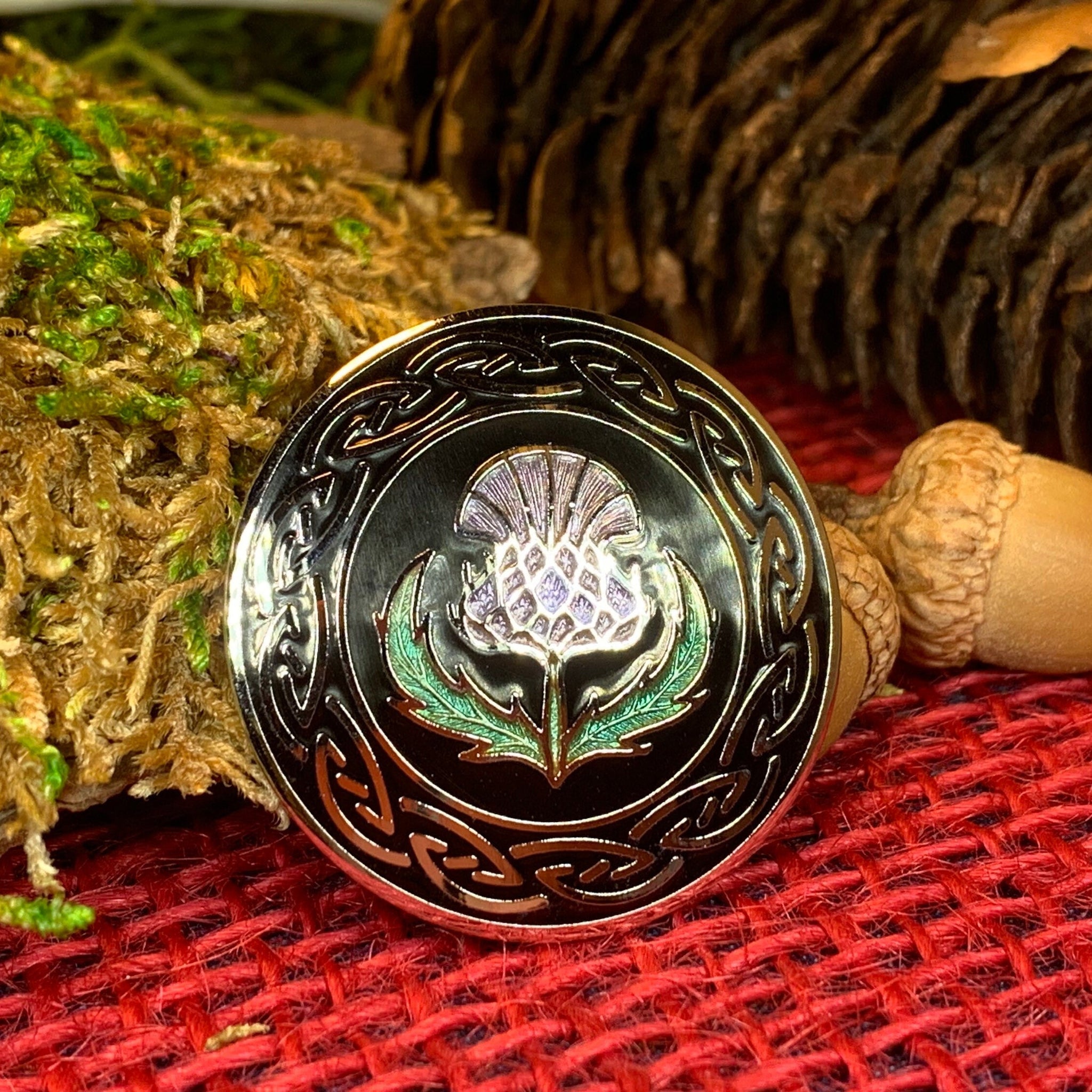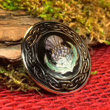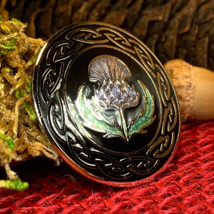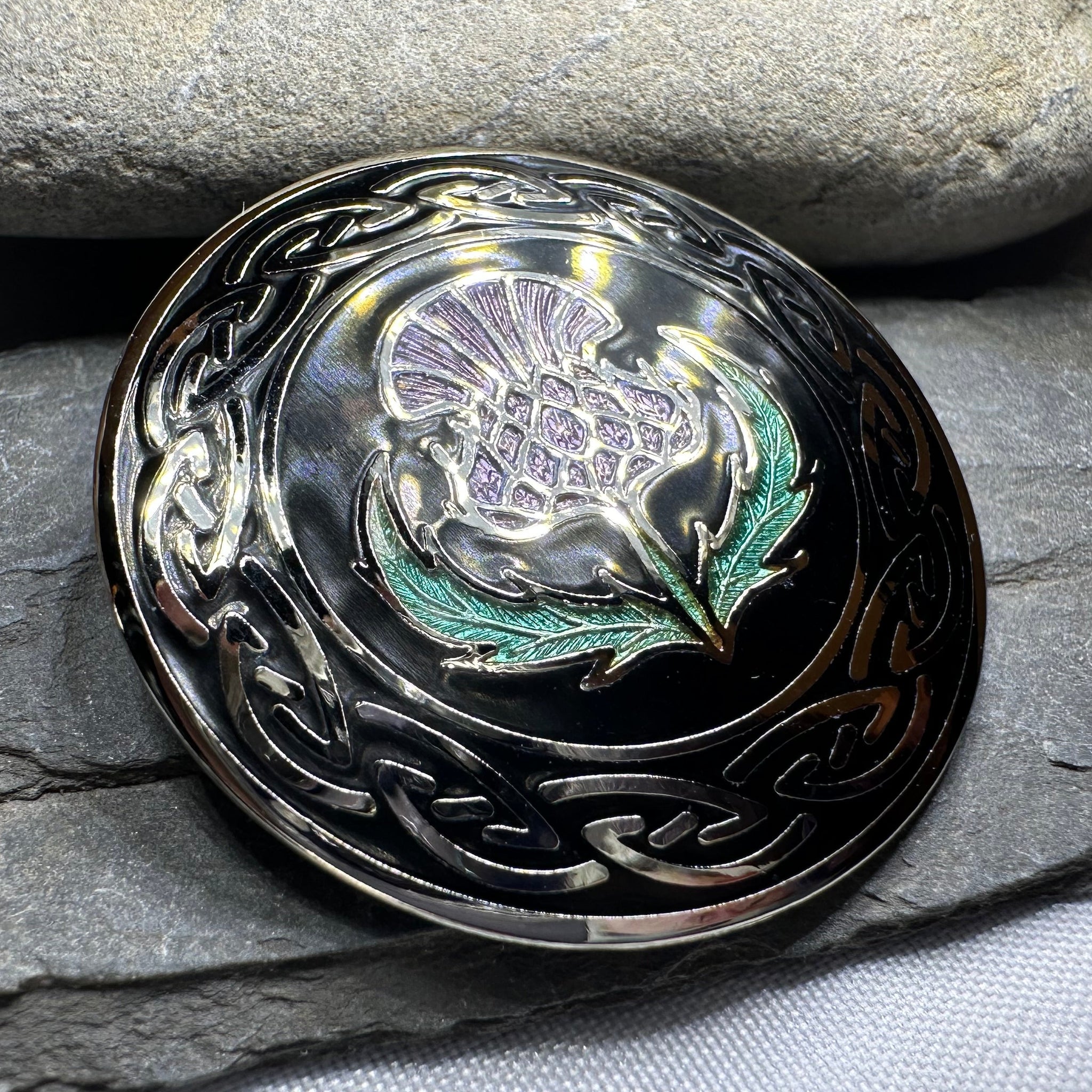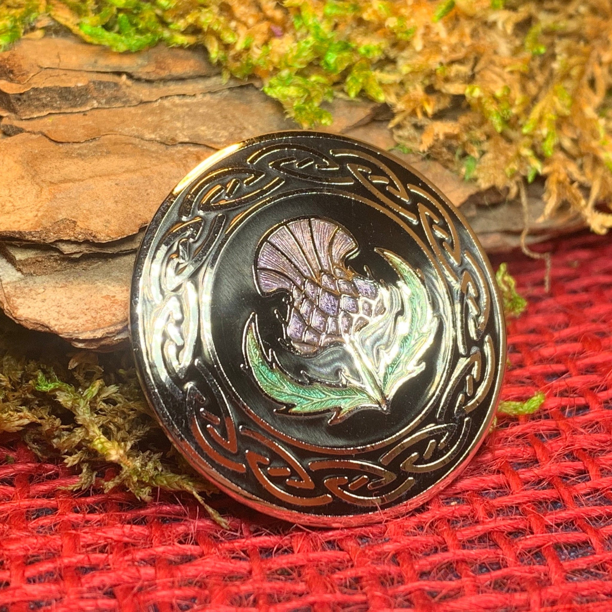 Silver-tone over pewter Celtic Thistl brooch. A beautifully detailed brooch that will be a real attention getter! Perfect for a jacket, tartan, coat or sweater.
