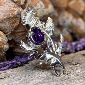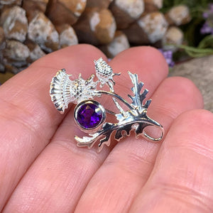 Solid sterling silver Scottish thistle brooch measuring 1" x 3/4" with a faceted amethyst zirconia gemstone (1 carat).