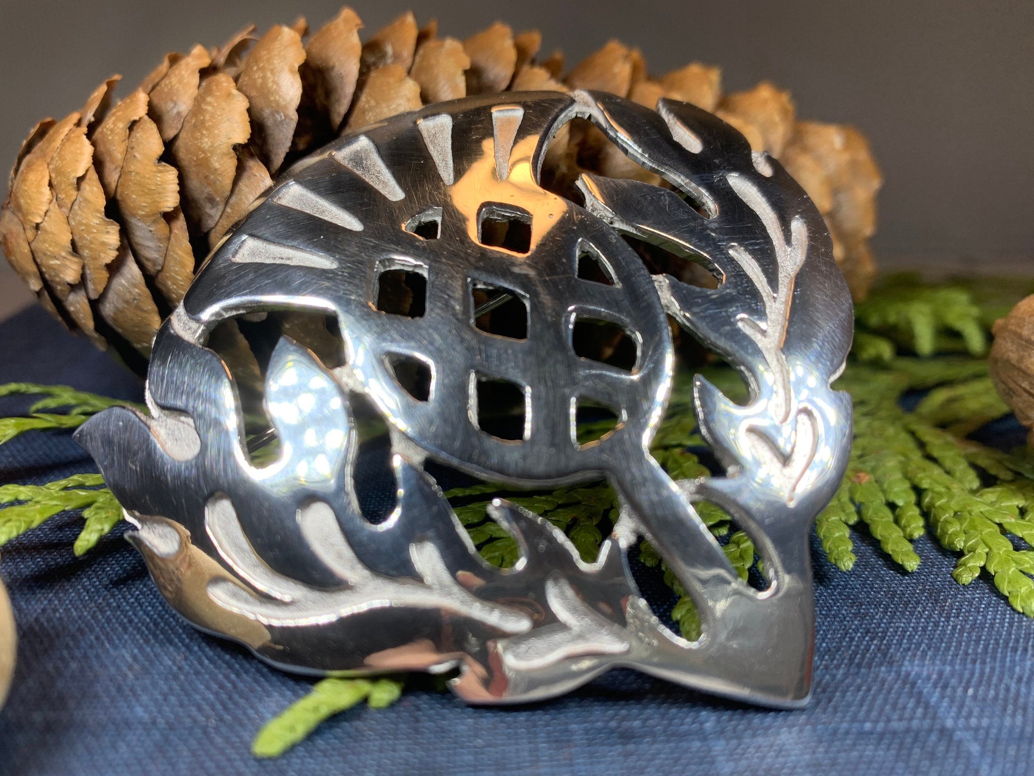 Throughout Celtic regions, thistle represents bravery, devotion, durability, strength, and determination celebrated in this pewter pin.