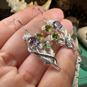 Solid Sterling Silver with authentic amethyst and peridot gemstones - An attractive pair of Scottish Thistle Sterling Silver Earrings using a traditional design featuring the Scottish Thistle, the national emblem of Scotland.