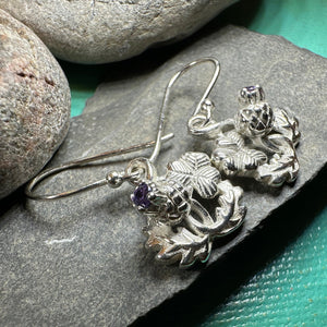 Solid Sterling Silver Amethyst Thistle and Shamrock drop earrings with natural amethyst gemstone