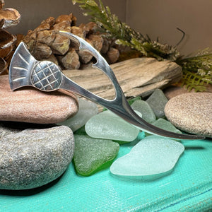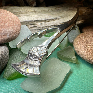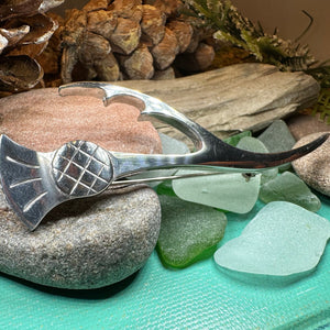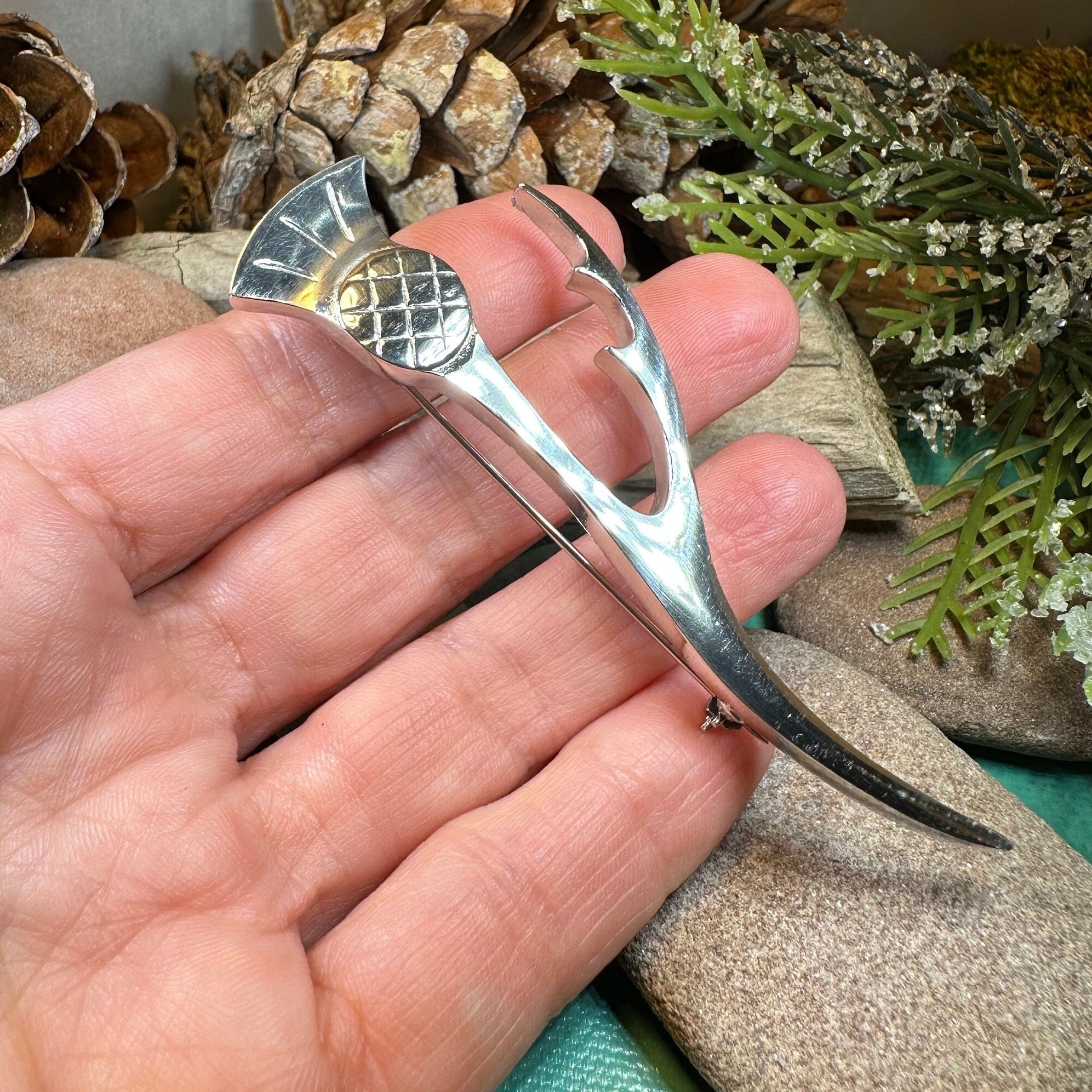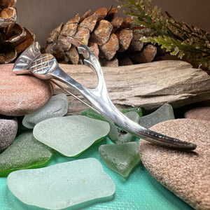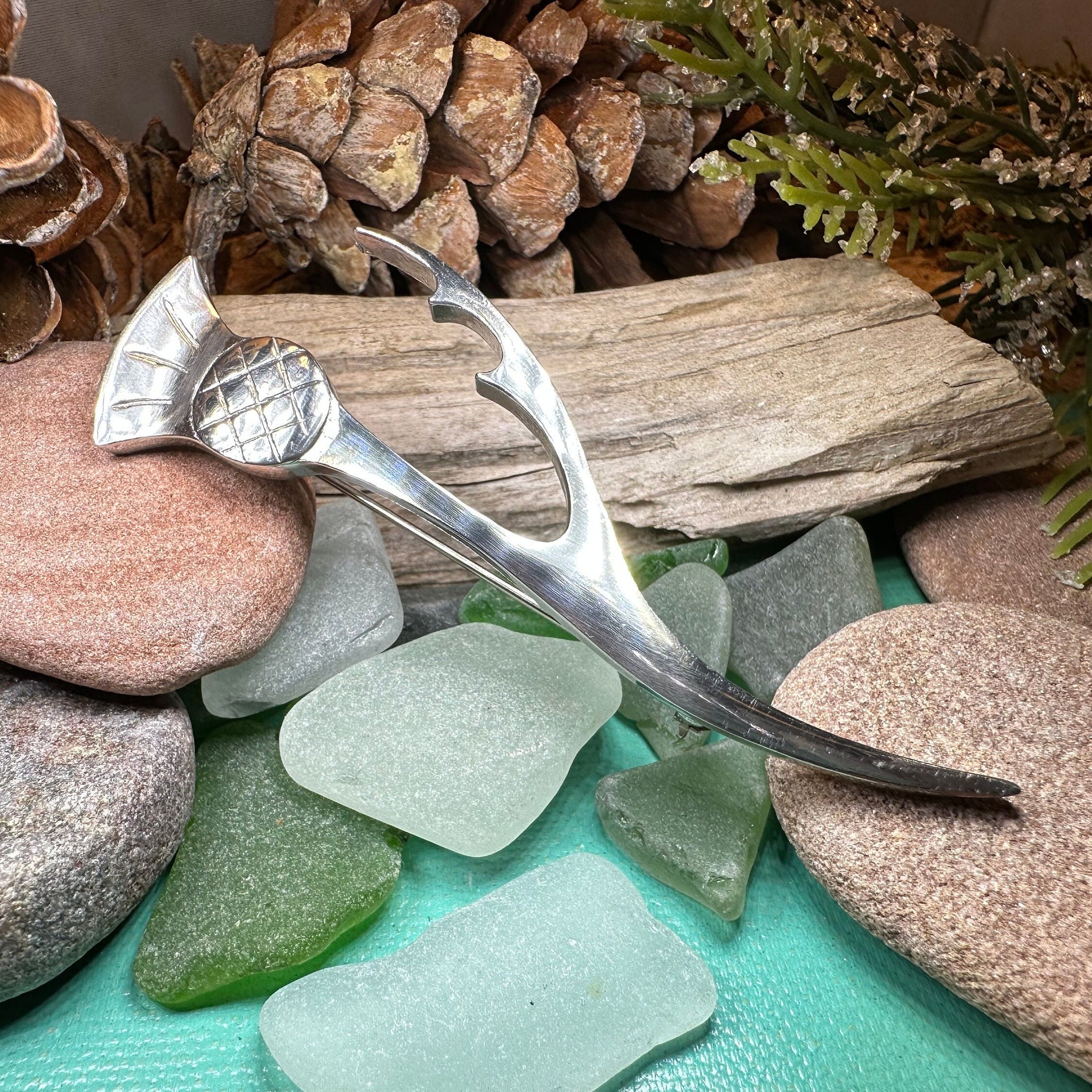 This lovely thistle with a twist of a leaf scrolling towards the flower and open work on the thistle itself makes a lovely brooch for a kilt, sweater or coat. This kilt pin has simple, modern lines that make a striking addition to any kilt or tartan.