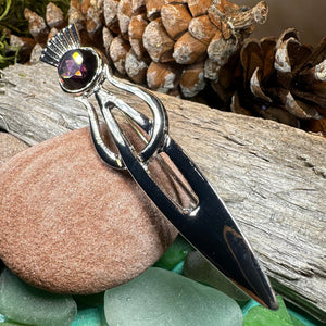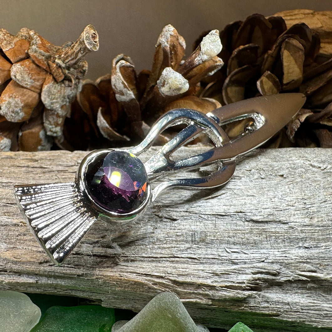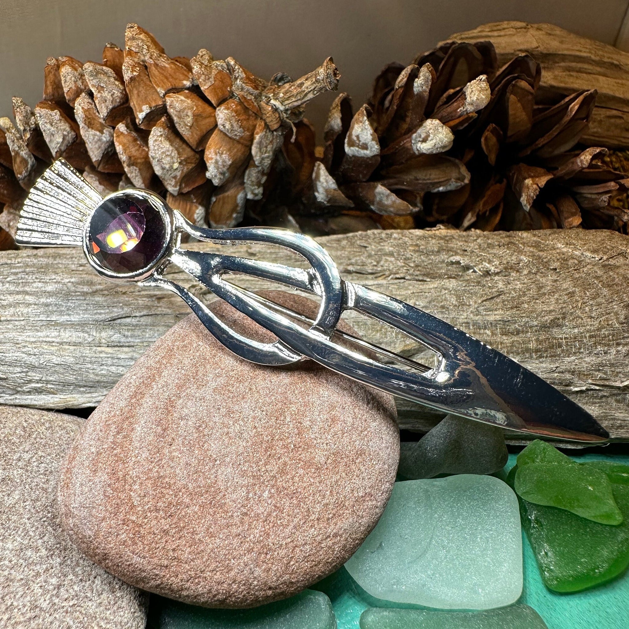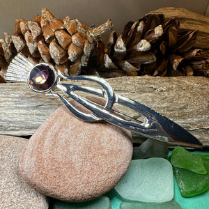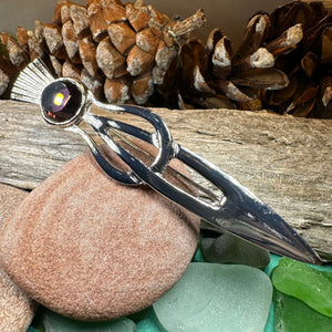 Thistle Kilt Pin/Brooch in polished pewter with purple center - 3 1/2" x 3/4" in size.