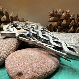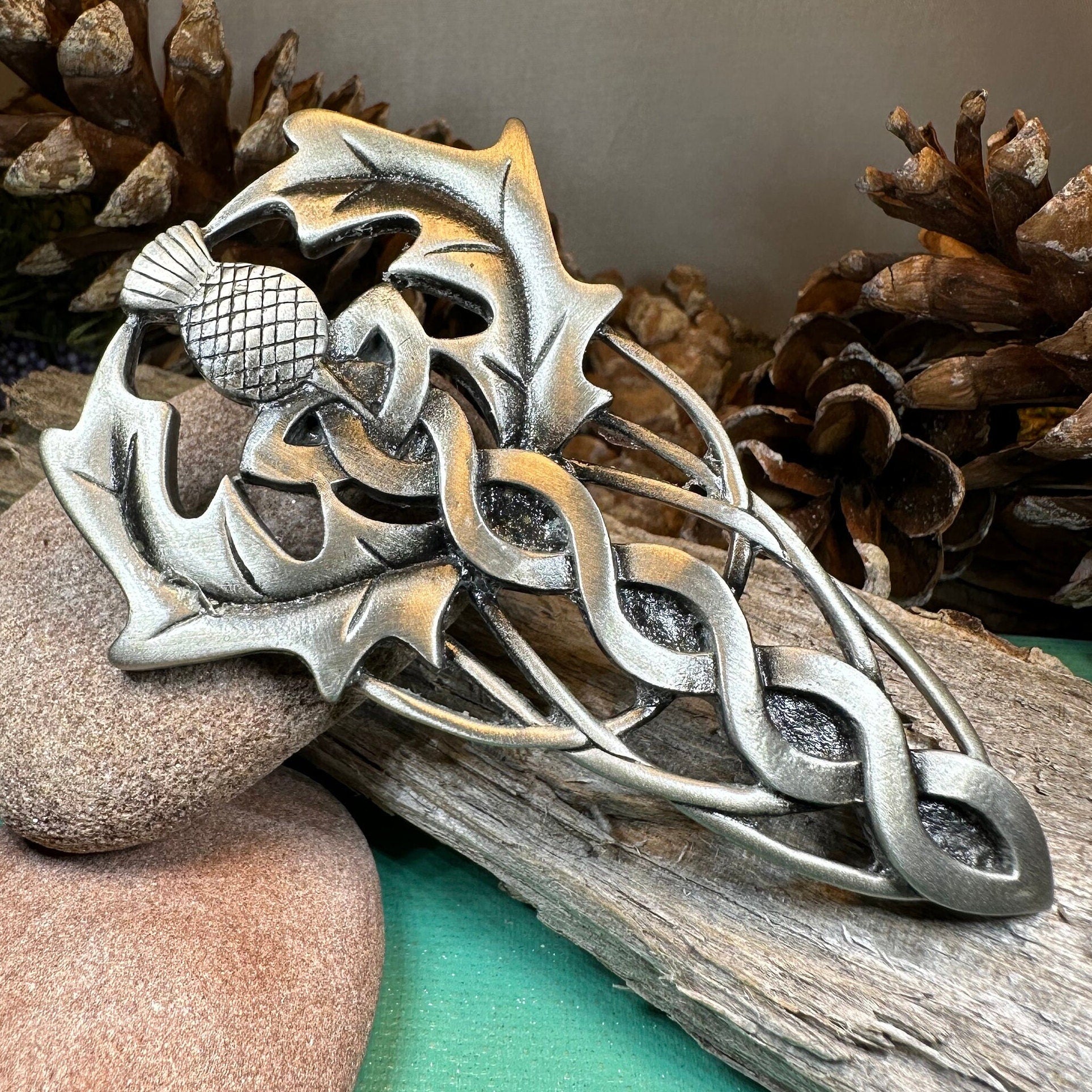 Inspirational! This Pewter Thistle, & Celtic Knot Kilt Pin masterfully combines three of the most recognizable symbol of Scotland. This heirloom piece will certainly draw attention!