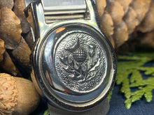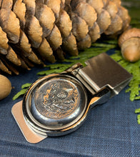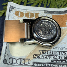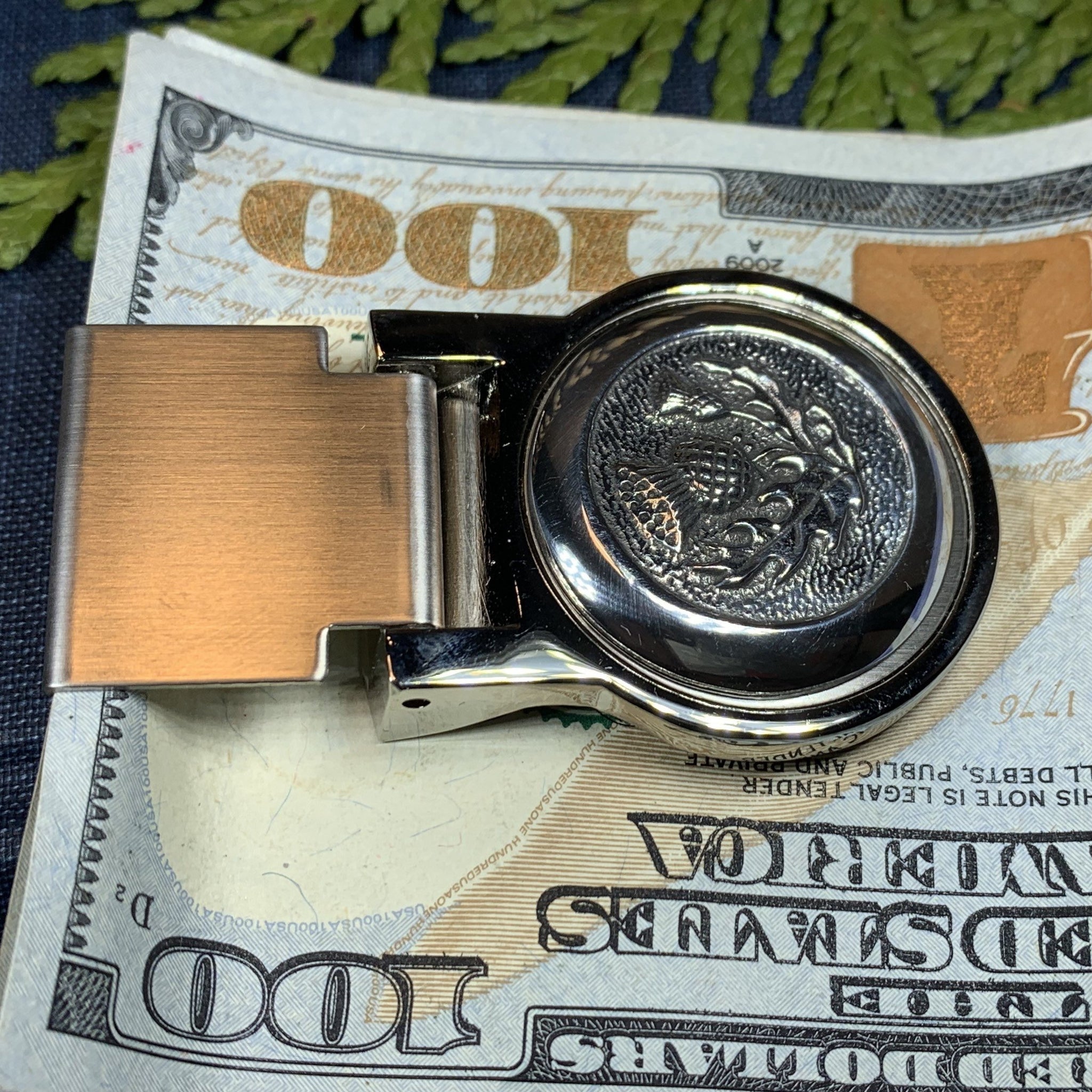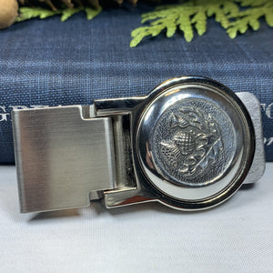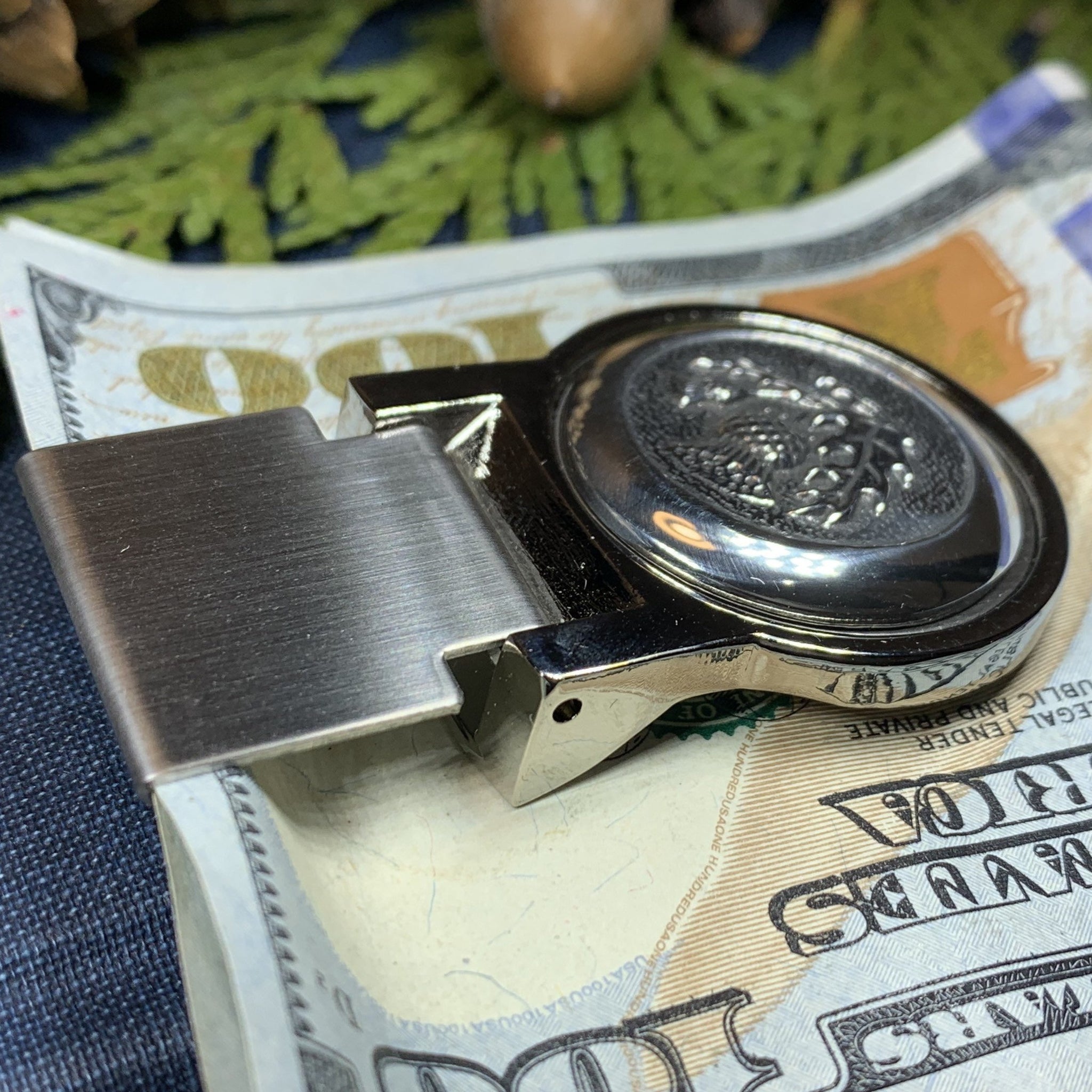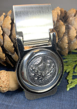 Beautiful stainless steel money clip with a matte finish and pewter focal piece. A classic Celtic Thor's Hammer design set into a pewter money clamp.